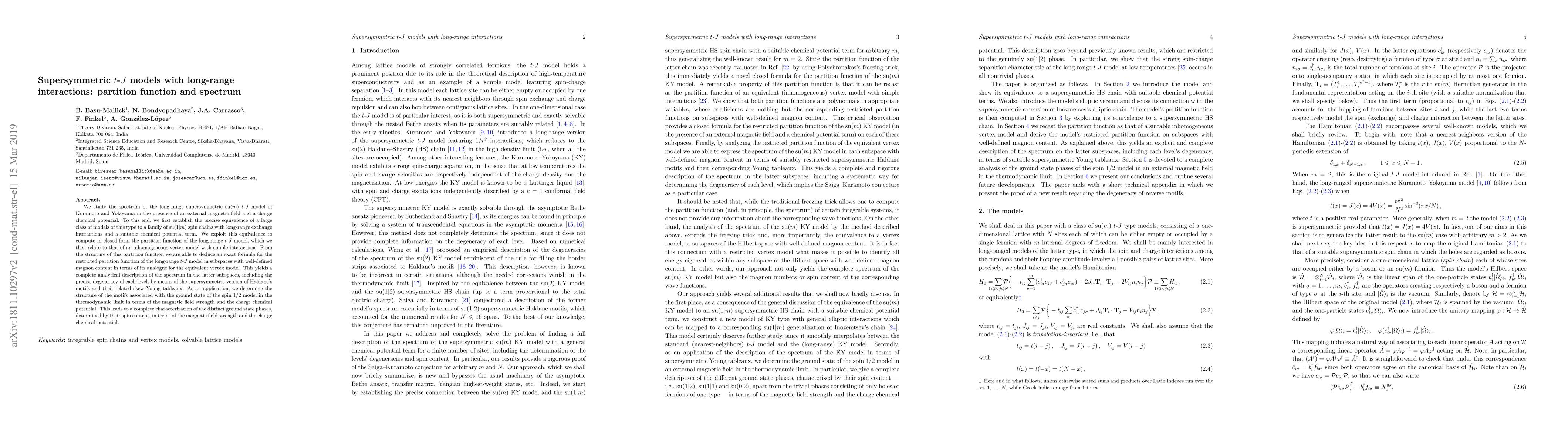 We study the spectrum of the long-range supersymmetric su$(m)$ $t$-$J$ model of Kuramoto and Yokoyama in the presence of an external magnetic field and a charge chemical potential. To this end, we first establish the precise equivalence of a large class of models of this type to a family of su$(1|m)$ spin chains with long-range exchange interactions and a suitable chemical potential term. We exploit this equivalence to compute in closed form the partition function of the long-range $t$-$J$ model, which we then relate to that of an inhomogeneous vertex model with simple interactions. From the structure of this partition function we are able to deduce an exact formula for the restricted partition function of the long-range $t$-$J$ model in subspaces with well-defined magnon content in terms of its analogue for the equivalent vertex model. This yields a complete analytical description of the spectrum in the latter subspaces, including the precise degeneracy of each level, by means of the supersymmetric version of Haldane's motifs and their related skew Young tableaux. As an application, we determine the structure of the motifs associated with the ground state of the spin $1/2$ model in the thermodynamic limit in terms of the magnetic field strength and the charge chemical potential. This leads to a complete characterization of the distinct ground state phases, determined by their spin content, in terms of the magnetic field strength and the charge chemical potential.