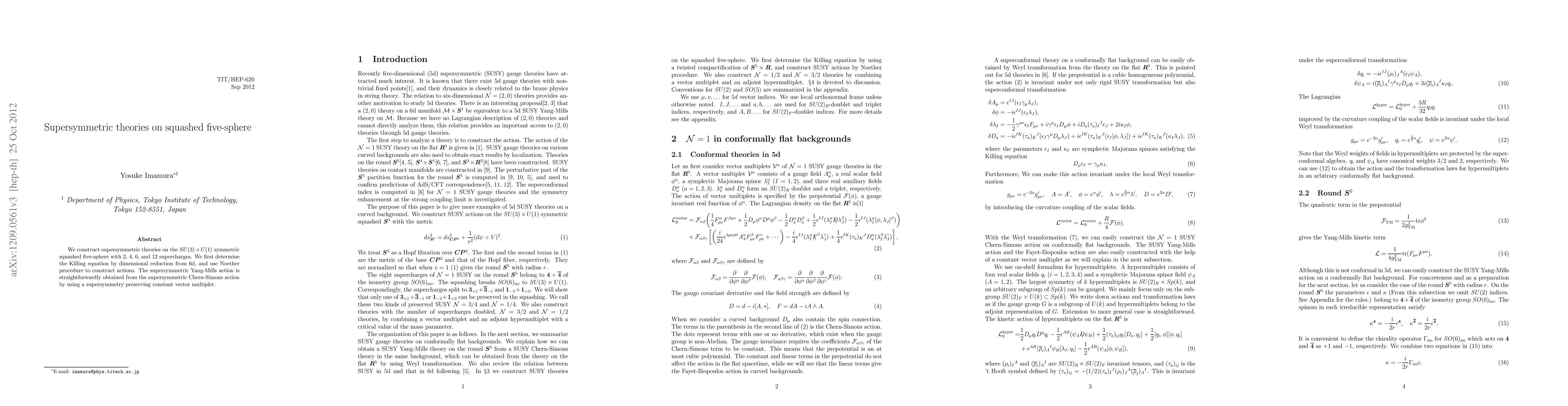 This paper constructs supersymmetric theories on a squashed five-sphere with SU(3)xU(1) symmetry, determining the Killing equation via dimensional reduction from 6d and employing the Noether procedure to build actions, particularly focusing on the supersymmetric Yang-Mills action derived from the supersymmetric Chern-Simons action.