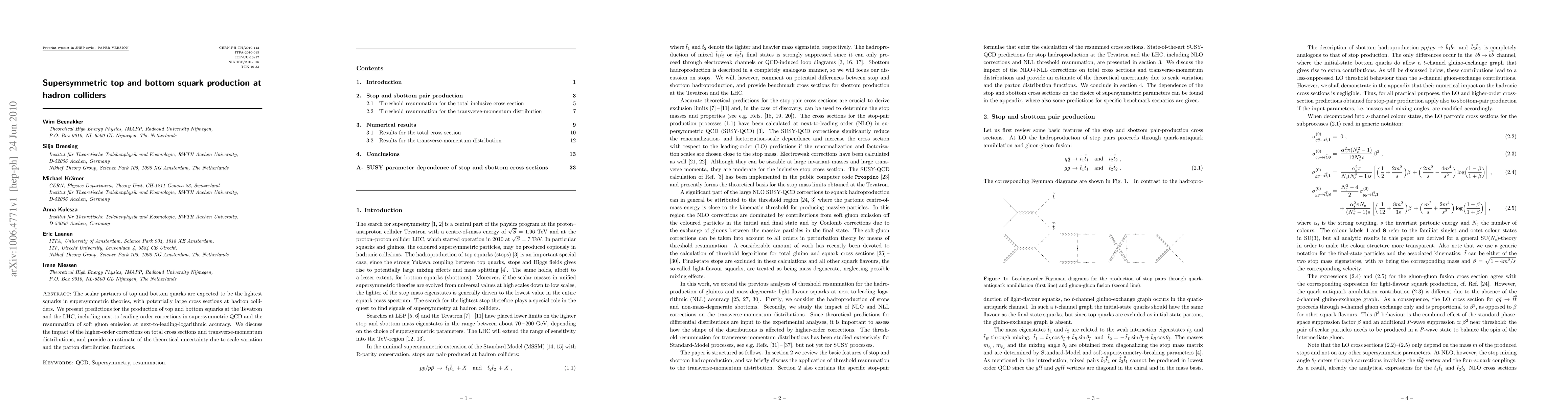 This paper presents predictions for the production of top and bottom squarks at hadron colliders, incorporating next-to-leading order corrections and soft gluon emission resummation. It analyzes the impact of higher-order corrections on cross sections and distributions, and estimates theoretical uncertainties.