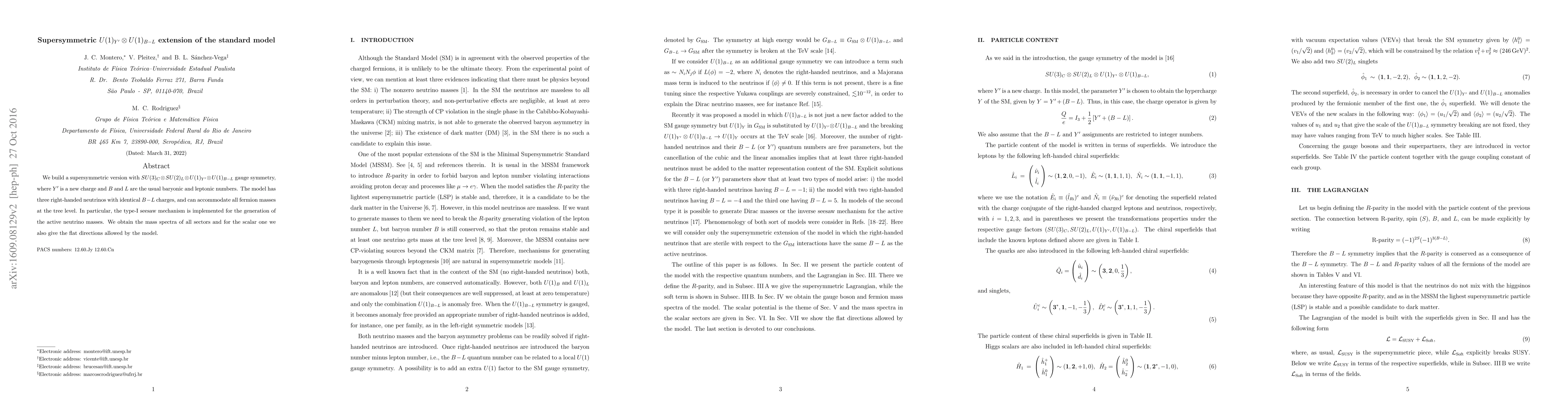 This paper proposes a supersymmetric extension of the Standard Model with gauge symmetry $SU(3)_C\otimes SU(2)_L\otimes U(1)_{Y^\prime}\otimes U(1)_{B-L}$ and incorporates three right-handed neutrinos. It utilizes the type-I seesaw mechanism to generate active neutrino masses and provides mass spectra for all sectors, including flat directions for scalar fields.