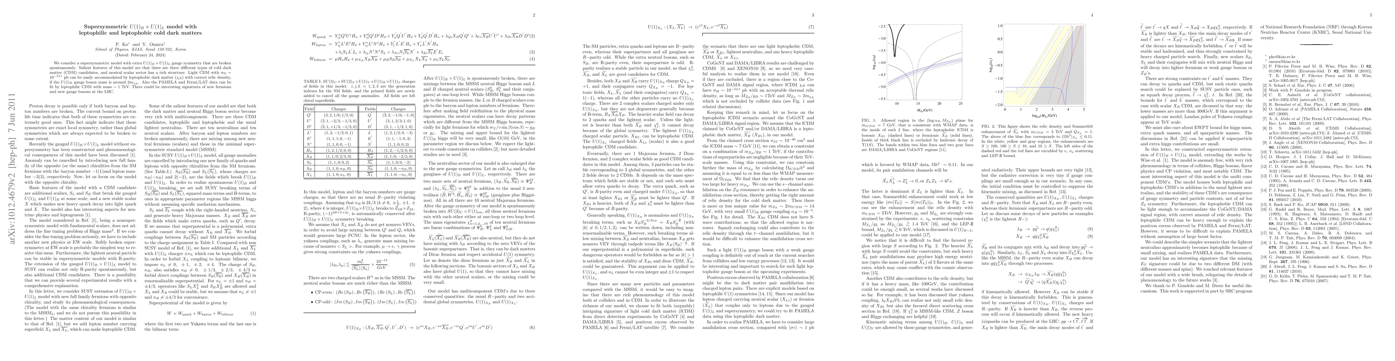 We consider a supersymmetric model with extra $U(1)_B \times U(1)_L$ gauge symmetry that are broken spontaneously. Salient features of this model are that there are three different types of cold dark matter (CDM) candidates, and neutral scalar sector has a rich structure. Light CDM with $\sigma_{\rm SI} \sim 10^{-3\pm 1}$ pb can be easily accommodated by leptophobic dark matter ($\chi_B$) with correct relic density, if the $U(1)_B$ gauge boson mass is around $2 m_{\chi_B}$. Also the PAMELA and Fermi/LAT data can be fit by leptophilic CDM with mass $\sim 1$ TeV. There could be interesting signatures of new fermions and new gauge bosons at the LHC.