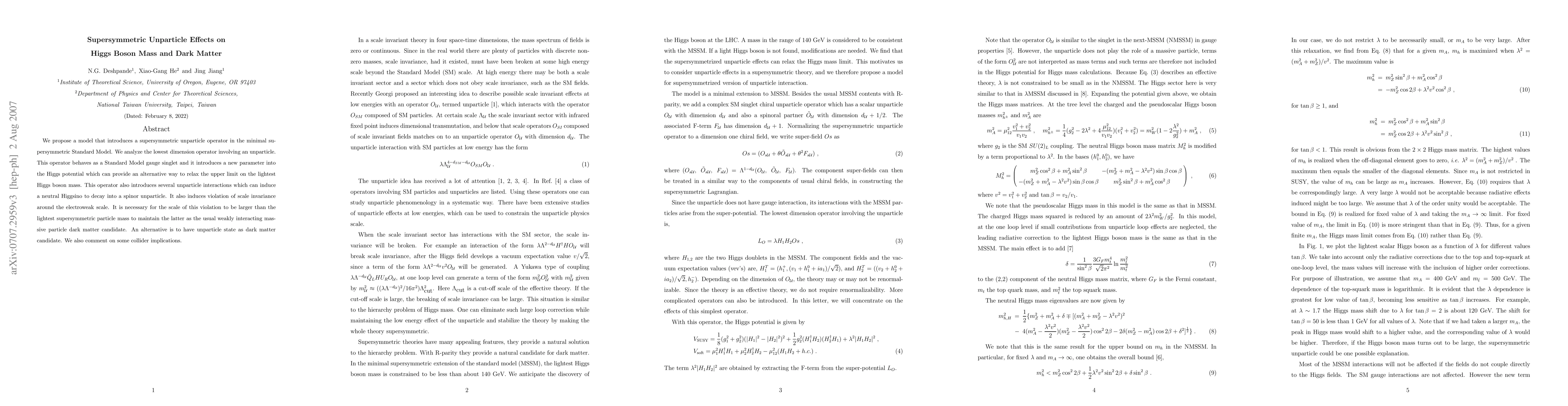 This paper proposes a supersymmetric unparticle operator in the minimal supersymmetric Standard Model, which can relax the upper limit on the Higgs boson mass and induce decay of neutral Higgsinos into spinor unparticles. It also discusses the implications for dark matter, either through the lightest supersymmetric particle or a possible unparticle state.