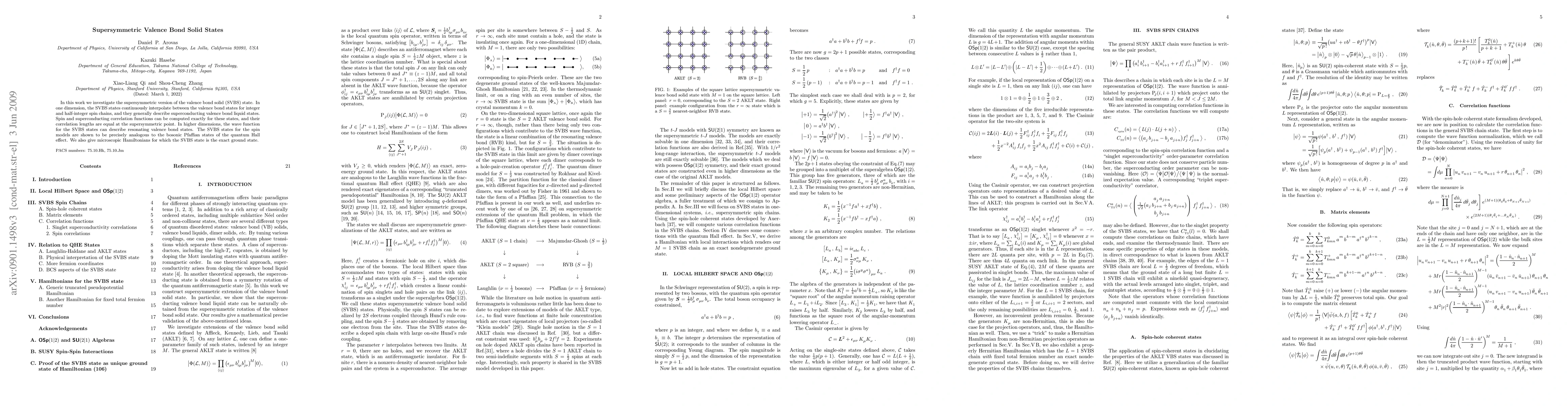 In this work we investigate the supersymmetric version of the valence bond solid (SVBS) state. In one dimension, the SVBS states continuously interpolate between the valence bond states for integer and half-integer spin chains, and they generally describe superconducting valence bond liquid states. Spin and superconducting correlation functions can be computed exactly for these states, and their correlation lengths are equal at the supersymmetric point. In higher dimensions, the wave function for the SVBS states can describe resonating valence bond states (RVB). The SVBS states for the spin models are shown to be precisely analogous to the bosonic Pfaffian states of the quantum Hall effect. We also give microscopic Hamiltonians for which the SVBS state is the exact ground state.