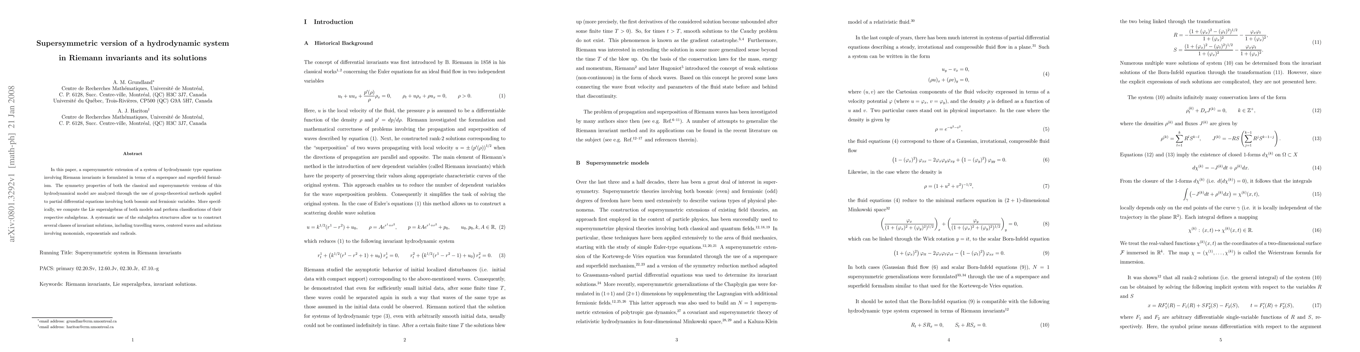 In this paper, a supersymmetric extension of a system of hydrodynamic type equations involving Riemann invariants is formulated in terms of a superspace and superfield formalism. The symmetry properties of both the classical and supersymmetric versions of this hydrodynamical model are analyzed through the use of group-theoretical methods applied to partial differential equations involving both bosonic and fermionic variables. More specifically, we compute the Lie superalgebras of both models and perform classifications of their respective subalgebras. A systematic use of the subalgebra structures allow us to construct several classes of invariant solutions, including travelling waves, centered waves and solutions involving monomials, exponentials and radicals.