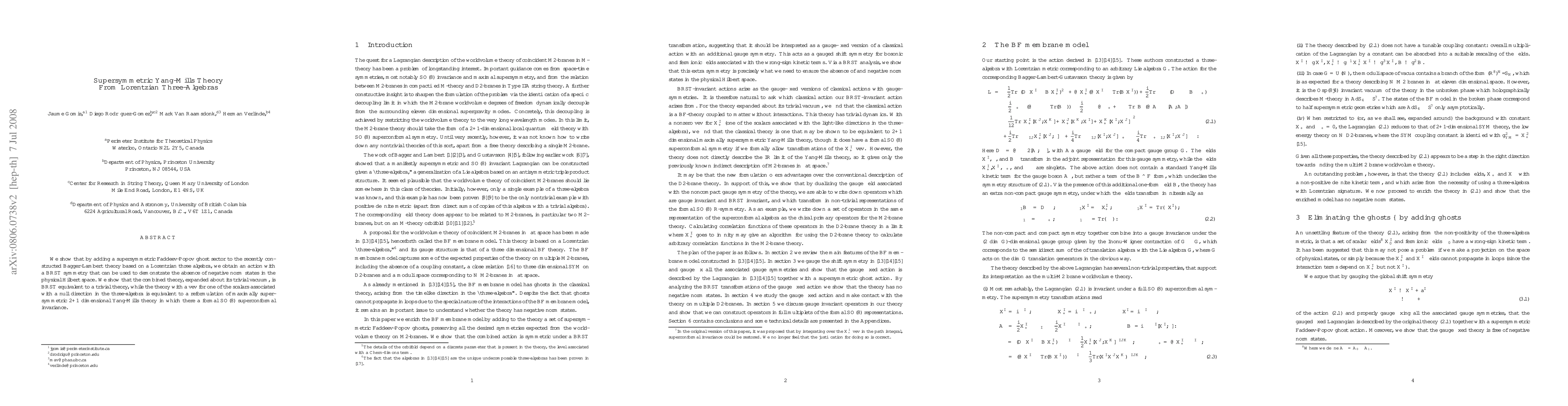 This research constructs a supersymmetric Yang-Mills theory based on a Lorentzian three-algebra by integrating a Faddeev-Popov ghost sector into the Bagger-Lambert theory, demonstrating BRST symmetry and absence of negative norm states. The expanded theory is equivalent to a trivial theory, while a version with a vacuum expectation value for a specific scalar is reformulated as maximally supersymmetric 2+1 dimensional Yang-Mills theory with SO(8) superconformal invariance.