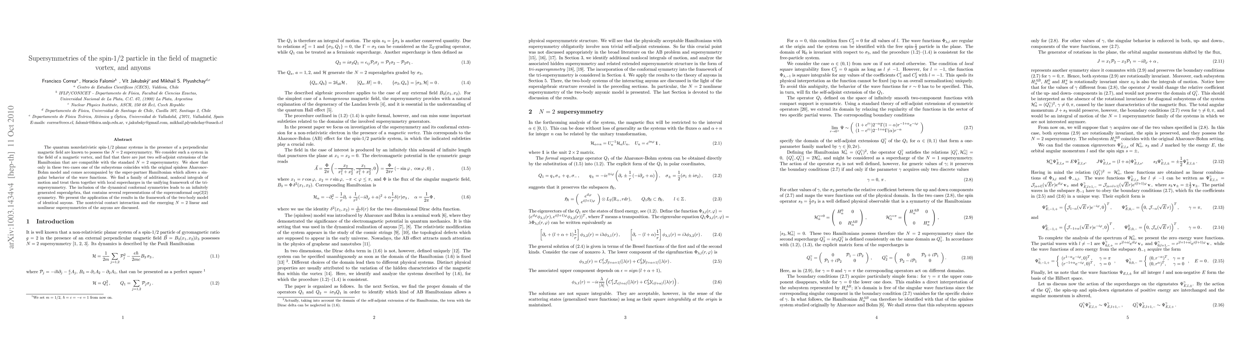 The quantum nonrelativistic spin-1/2 planar systems in the presence of a perpendicular magnetic field are known to possess the N=2 supersymmetry. We consider such a system in the field of a magnetic vortex, and find that there are just two self-adjoint extensions of the Hamiltonian that are compatible with the standard N=2 supersymmetry. We show that only in these two cases one of the subsystems coincides with the original spinless Aharonov-Bohm model and comes accompanied by the super-partner Hamiltonian which allows a singular behavior of the wave functions. We find a family of additional, nonlocal integrals of motion and treat them together with local supercharges in the unifying framework of the tri-supersymmetry. The inclusion of the dynamical conformal symmetries leads to an infinitely generated superalgebra, that contains several representations of the superconformal osp(2|2) symmetry. We present the application of the results in the framework of the two-body model of identical anyons. The nontrivial contact interaction and the emerging N=2 linear and nonlinear supersymmetries of the anyons are discussed.