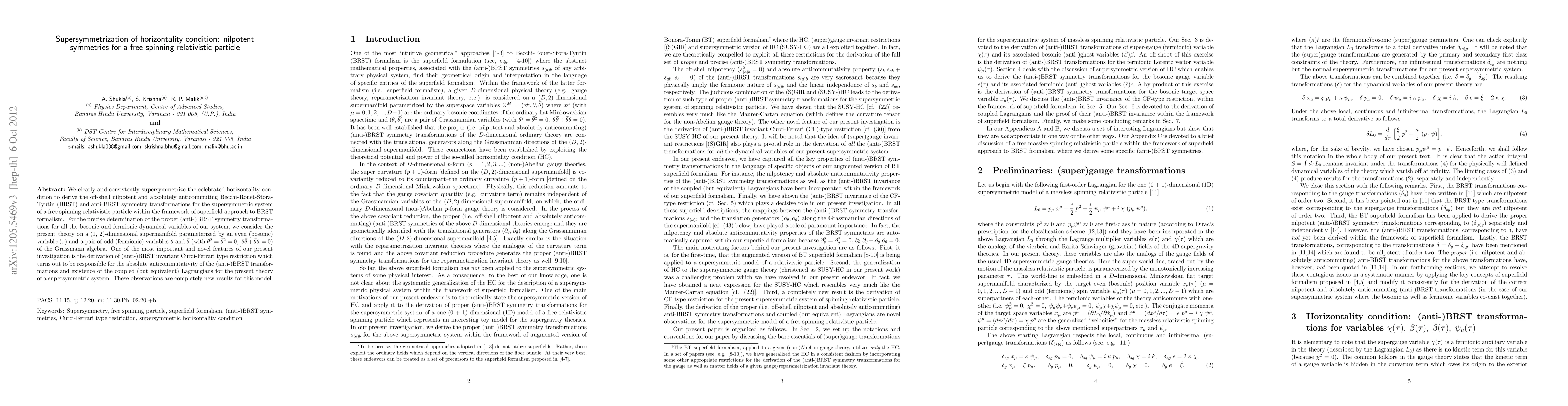 This paper derives nilpotent symmetries for a free spinning relativistic particle with supersymmetry, introducing a modified horizontality condition to determine bosonic and fermionic symmetry transformations.