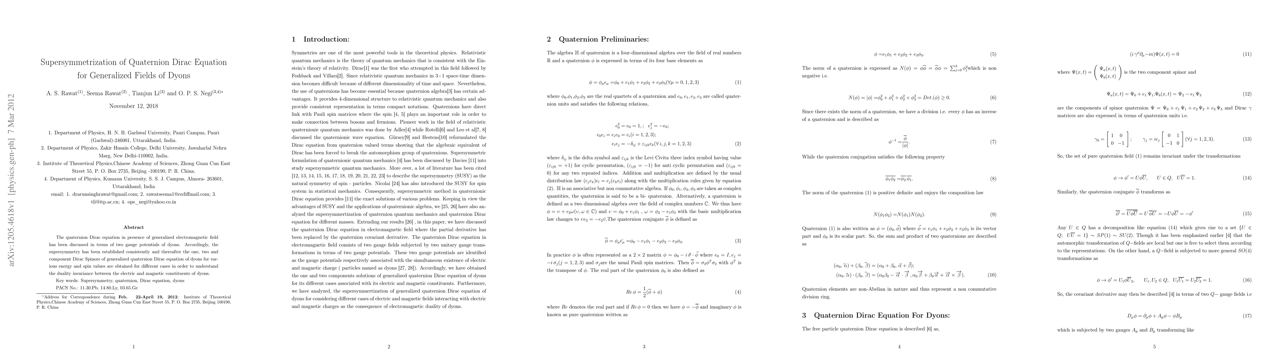This paper explores the quaternion Dirac equation under generalized electromagnetic fields, introducing gauge potentials for dyons. It establishes supersymmetry and derives one, two, and component Dirac spinors to understand duality invariance between electric and magnetic components of dyons.