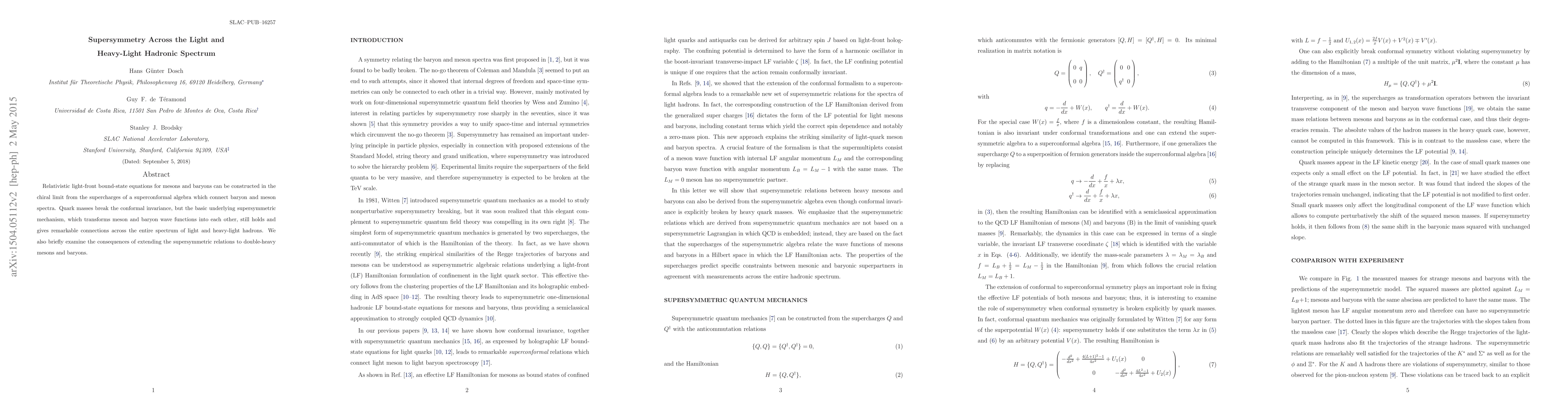Relativistic light-front bound-state equations for mesons and baryons can be constructed in the chiral limit from the supercharges of a superconformal algebra which connect baryon and meson spectra. Quark masses break the conformal invariance, but the basic underlying supersymmetric mechanism, which transforms meson and baryon wave functions into each other, still holds and gives remarkable connections across the entire spectrum of light and heavy-light hadrons. We also briefly examine the consequences of extending the supersymmetric relations to double-heavy mesons and baryons.