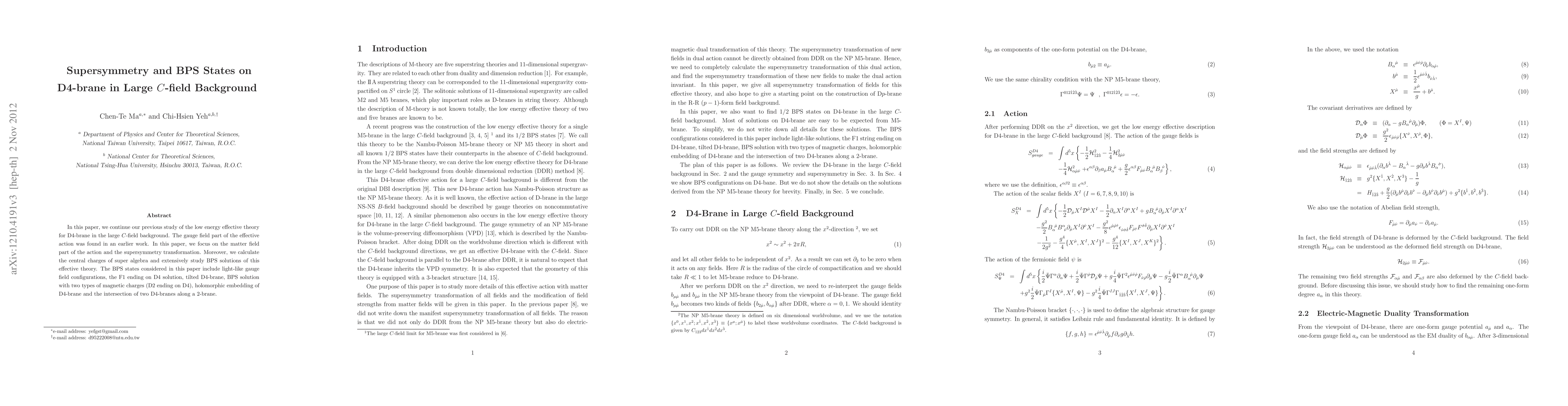 This research investigates the low energy effective theory for D4-branes in a large C-field background, focusing on the matter field part and supersymmetry transformations. It calculates central charges and explores BPS states, including configurations like light-like gauge fields and intersections of D4-branes.
