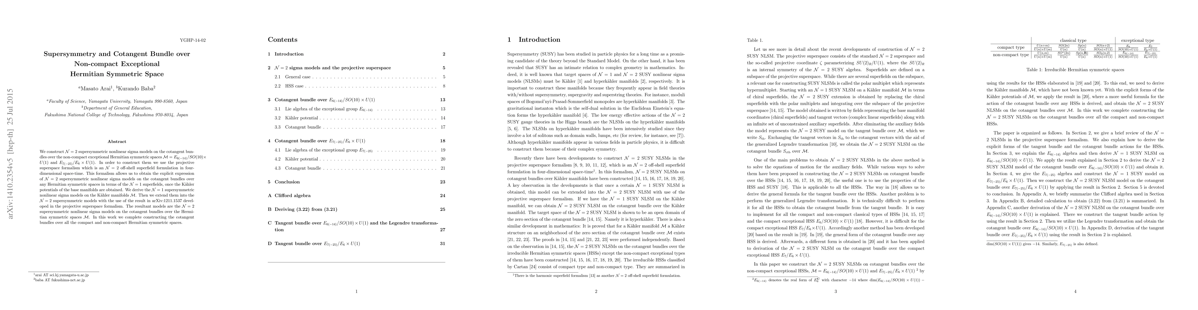 This paper constructs N=2 supersymmetric nonlinear sigma models on cotangent bundles over the non-compact exceptional Hermitian symmetric spaces E_{6(-14)} and E_{7(-25)}. The construction uses the projective superspace formalism to derive explicit expressions for these models.