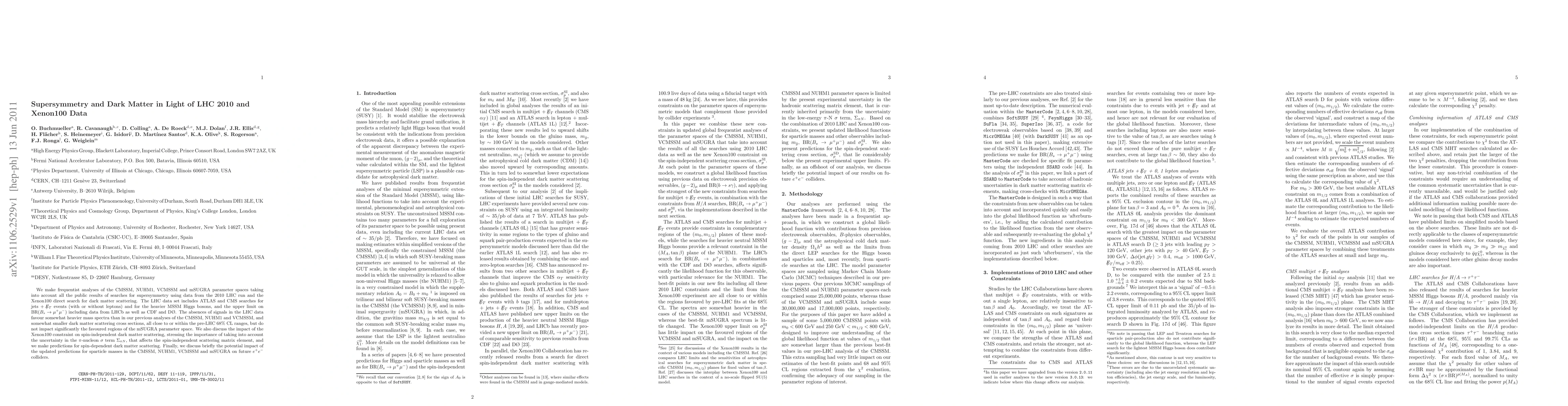 We make frequentist analyses of the CMSSM, NUHM1, VCMSSM and mSUGRA parameter spaces taking into account all the public results of searches for supersymmetry using data from the 2010 LHC run and the Xenon100 direct search for dark matter scattering. The LHC data set includes ATLAS and CMS searches for jets + ETslash events (with or without leptons) and for the heavier MSSM Higgs bosons, and the upper limit on bs to mu mu including data from LHCb as well as CDF and D0. The absences of signals in the LHC data favour somewhat heavier mass spectra than in our previous analyses of the CMSSM, NUHM1 and VCMSSM, and somewhat smaller dark matter scattering cross sections, all close to or within the pre-LHC 68% CL ranges, but do not impact significantly the favoured regions of the mSUGRA parameter space. We also discuss the impact of the Xenon100 constraint on spin-independent dark matter scattering, stressing the importance of taking into account the uncertainty in the pi-nucleon sigma term, that affects the spin-independent scattering matrix element, and we make predictions for spin-dependent dark matter scattering. Finally, we discuss briefly the potential impact of the updated predictions for sparticle masses in the CMSSM, NUHM1, VCMSSM and mSUGRA on future e+ e- colliders.