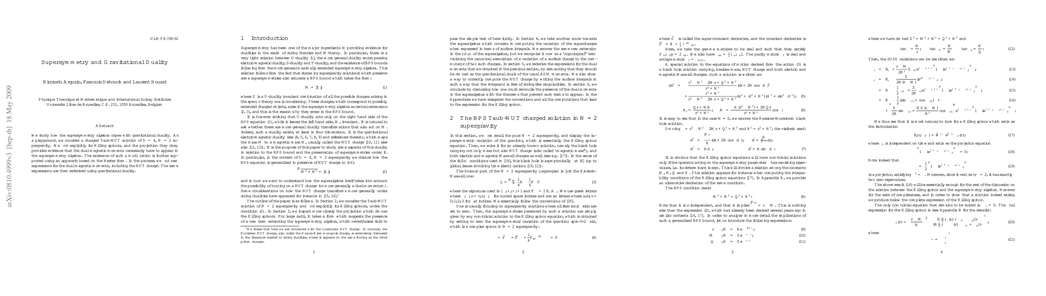 We study how the supersymmetry algebra copes with gravitational duality. As a playground, we consider a charged Taub-NUT solution of D=4, N=2 supergravity. We find explicitly its Killing spinors, and the projection they obey provides evidence that the dual magnetic momenta necessarily have to appear in the supersymmetry algebra. The existence of such a modification is further supported using an approach based on the Nester form. In the process, we find new expressions for the dual magnetic momenta, including the NUT charge. The same expressions are then rederived using gravitational duality.