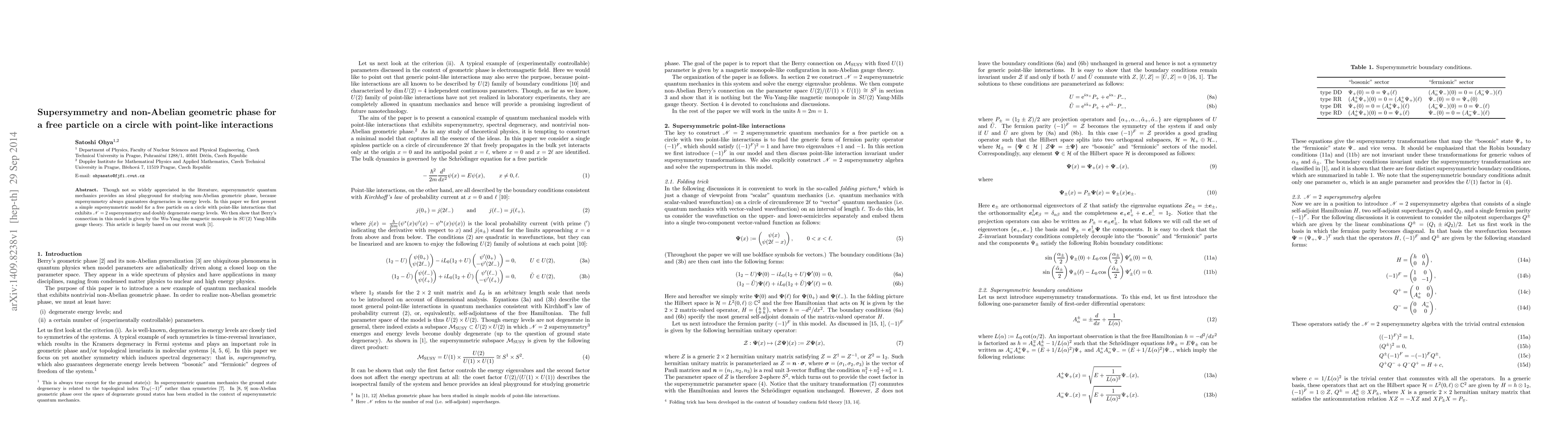 This paper explores a supersymmetric model for a free particle on a circle with point-like interactions, demonstrating $\mathscr{N} = 2$ supersymmetry and doubly degenerate energy levels. The study reveals that the geometric phase in this model corresponds to the Wu-Yang-like magnetic monopole in SU(2) Yang-Mills gauge theory.
