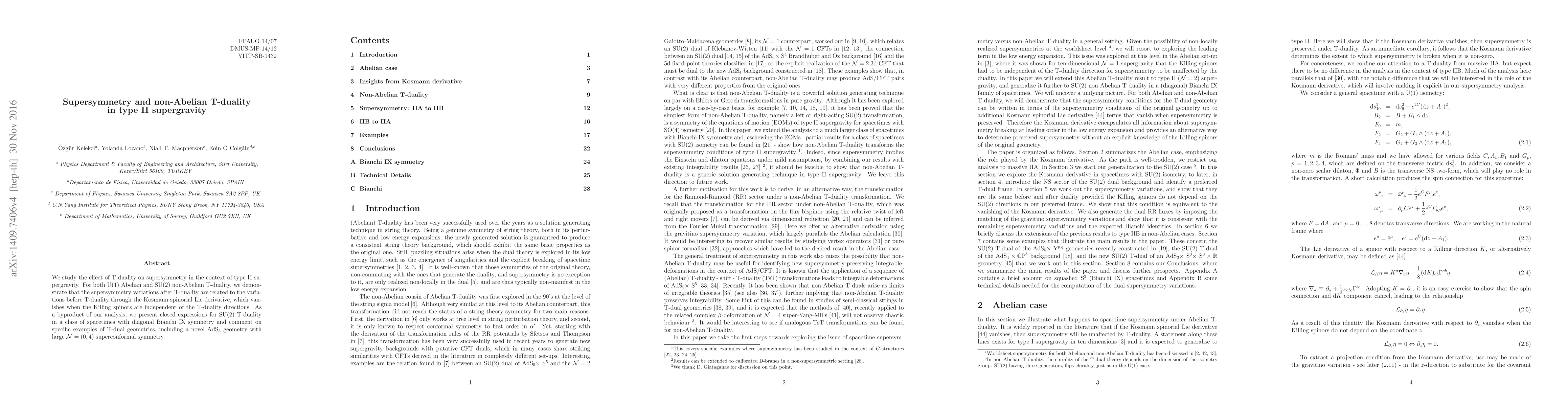 This paper investigates the impact of T-duality on supersymmetry in type II supergravity, showing that the supersymmetry variations post-T-duality relate to pre-T-duality variations via the Kosmann spinorial Lie derivative, especially under SU(2) non-Abelian T-duality. It also derives closed expressions for SU(2) T-duality in Bianchi IX symmetric spacetimes and highlights a new AdS3 geometry with significant superconformal symmetry.