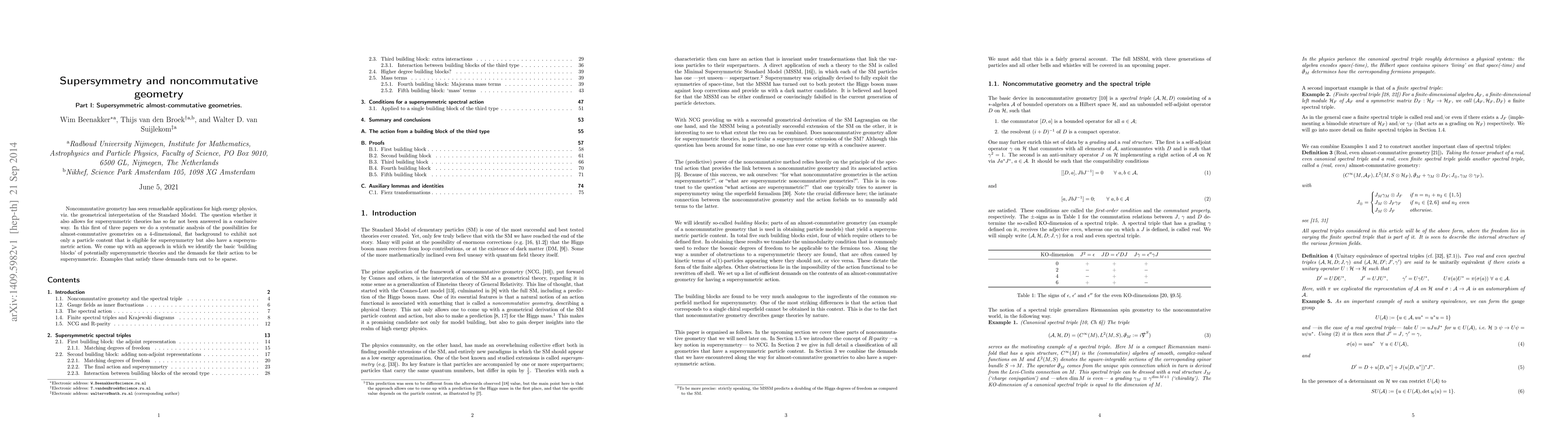 Noncommutative geometry has seen remarkable applications for high energy physics, viz. the geometrical interpretation of the Standard Model. The question whether it also allows for supersymmetric theories has so far not been answered in a conclusive way. In this first of three papers we do a systematic analysis of the possibilities for almost-commutative geometries on a 4-dimensional, flat background to exhibit not only a particle content that is eligible for supersymmetry but also have a supersymmetric action. We come up with an approach in which we identify the basic 'building blocks' of potentially supersymmetric theories and the demands for their action to be supersymmetric. Examples that satisfy these demands turn out to be sparse.
