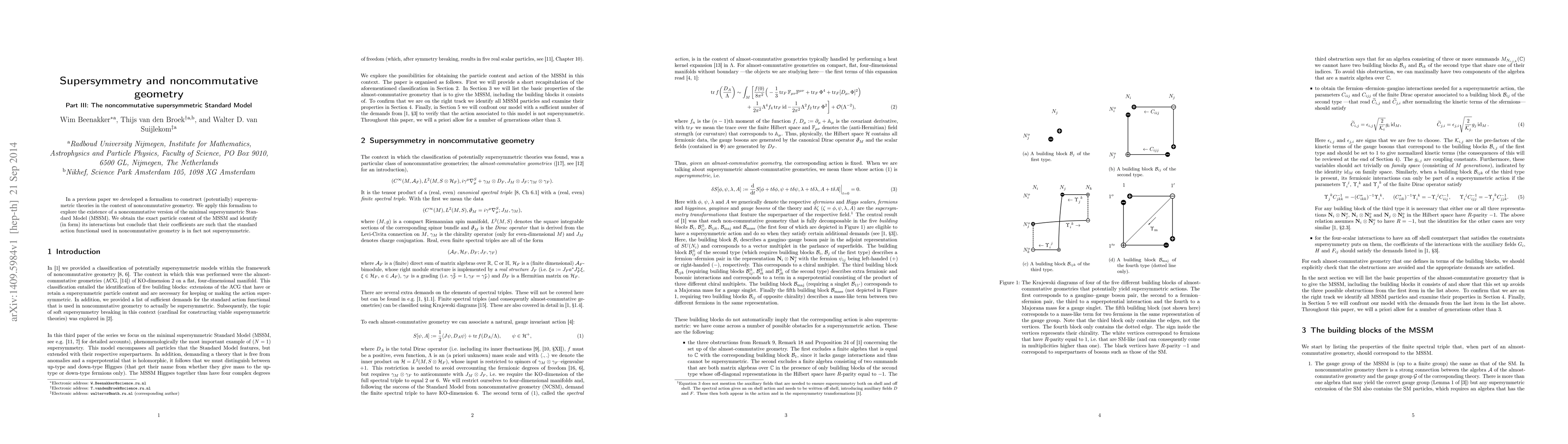 Summary: This paper applies a previously developed formalism for constructing supersymmetric theories in noncommutative geometry to the minimal supersymmetric Standard Model (MSSM), finding its exact particle content and interactions but concluding that the standard noncommutative action lacks supersymmetry.