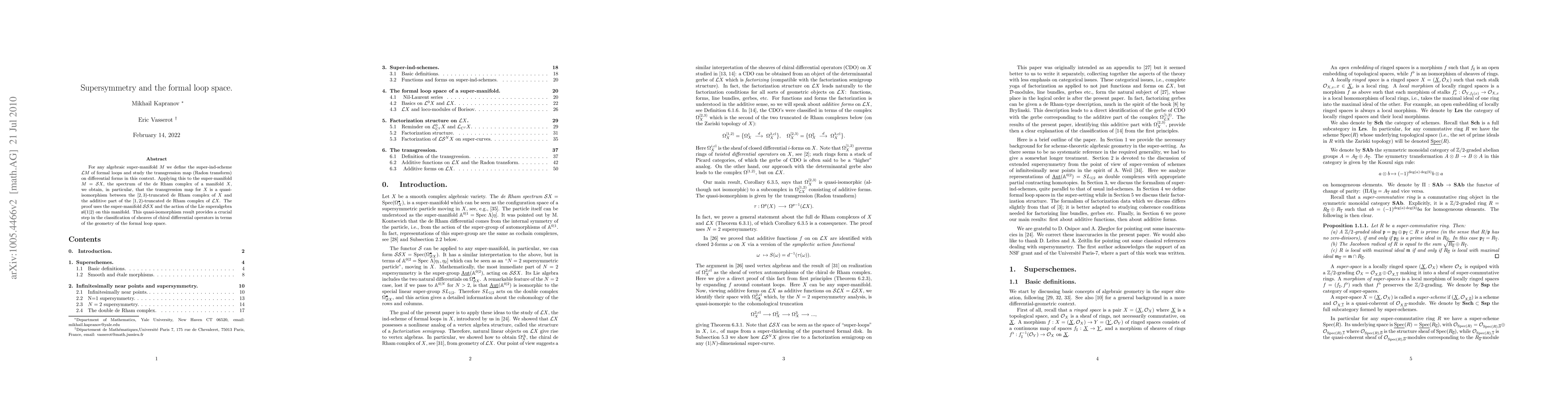 For any algebraic super-manifold M we define the super-ind-scheme LM of formal loops and study the transgression map (Radon transform) on differential forms in this context. Applying this to the super-manifold M=SX, the spectrum of the de Rham complex of a manifold X, we obtain, in particular, that the transgression map for X is a quasi-isomorphism between the [2,3)-truncated de Rham complex of X and the additive part of the [1,2)-truncated de Rham complex of LX. The proof uses the super-manifold SSX and the action of the Lie superalgebra sl(1|2) on this manifold. This quasi-isomorphism result provides a crucial step in the classification of sheaves of chiral differential operators in terms of geometry of the formal loop space.