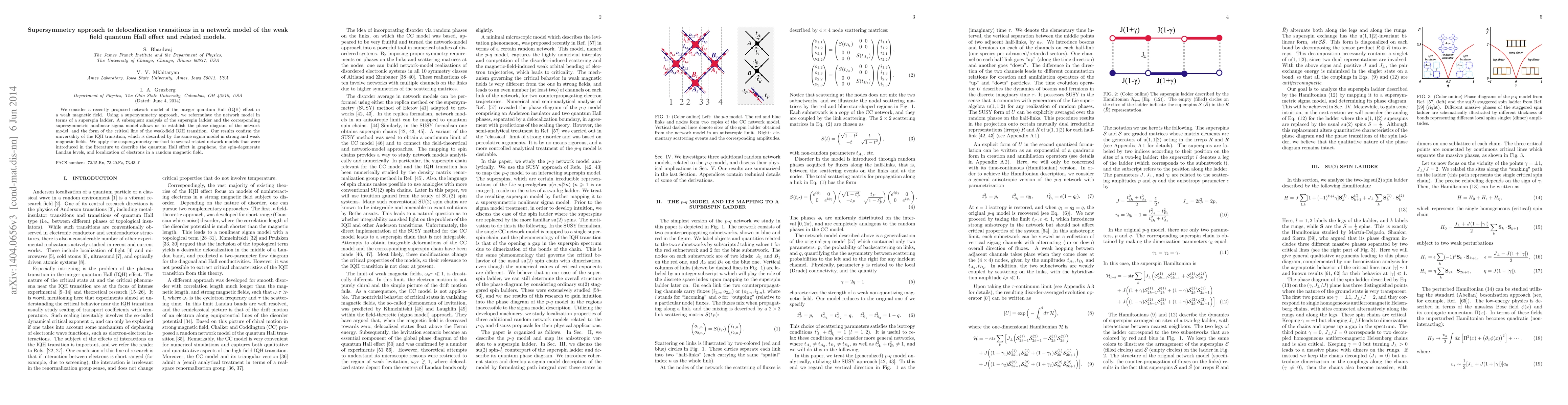 We consider a recently proposed network model of the integer quantum Hall (IQH) effect in a weak magnetic field. Using a supersymmetry approach, we reformulate the network model in terms of a superspin ladder. A subsequent analysis of the superspin ladder and the corresponding supersymmetric nonlinear sigma model allows to establish the phase diagram of the network model, and the form of the critical line of the weak-field IQH transition. Our results confirm the universality of the IQH transition, which is described by the same sigma model in strong and weak magnetic fields. We apply the suspersymmetry method to several related network models that were introduced in the literature to describe the quantum Hall effect in graphene, the spin-degenerate Landau levels, and localization of electrons in a random magnetic field.