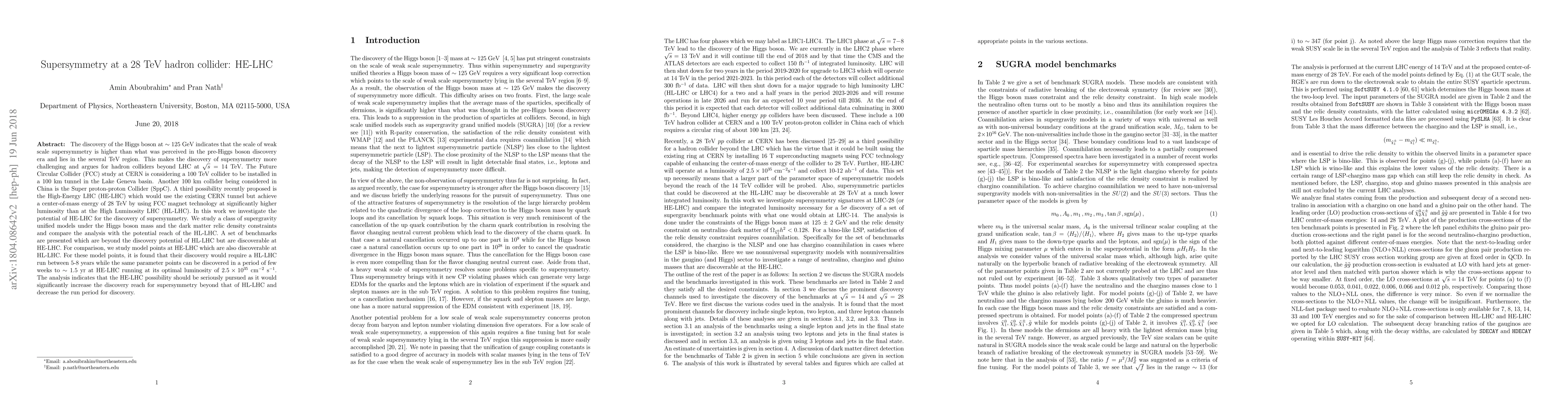 The discovery of the Higgs boson at $\sim 125$ GeV indicates that the scale of weak scale supersymmetry is higher than what was perceived in the pre-Higgs boson discovery era and lies in the several TeV region. This makes the discovery of supersymmetry more challenging and argues for hadron colliders beyond LHC at $\sqrt s=14$ TeV. The Future Circular Collider (FCC) study at CERN is considering a 100 TeV collider to be installed in a 100 km tunnel in the Lake Geneva basin. Another 100 km collider being considered in China is the Super proton-proton Collider (SppC). A third possibility recently proposed is the High-Energy LHC (HE-LHC) which would use the existing CERN tunnel but achieve a center-of-mass energy of 28 TeV by using FCC magnet technology at significantly higher luminosity than at the High Luminosity LHC (HL-LHC). In this work we investigate the potential of HE-LHC for the discovery of supersymmetry. We study a class of supergravity unified models under the Higgs boson mass and the dark matter relic density constraints and compare the analysis with the potential reach of the HL-LHC. A set of benchmarks are presented which are beyond the discovery potential of HL-LHC but are discoverable at HE-LHC. For comparison, we study model points at HE-LHC which are also discoverable at HL-LHC. For these model points, it is found that their discovery would require a HL-LHC run between 5-8 years while the same parameter points can be discovered in a period of few weeks to $\sim 1.5$ yr at HE-LHC running at its optimal luminosity of $2.5\times 10^{35}$ cm$^{-2}$ s$^{-1}$. The analysis indicates that the HE-LHC possibility should be seriously pursued as it would significantly increase the discovery reach for supersymmetry beyond that of HL-LHC and decrease the run period for discovery.