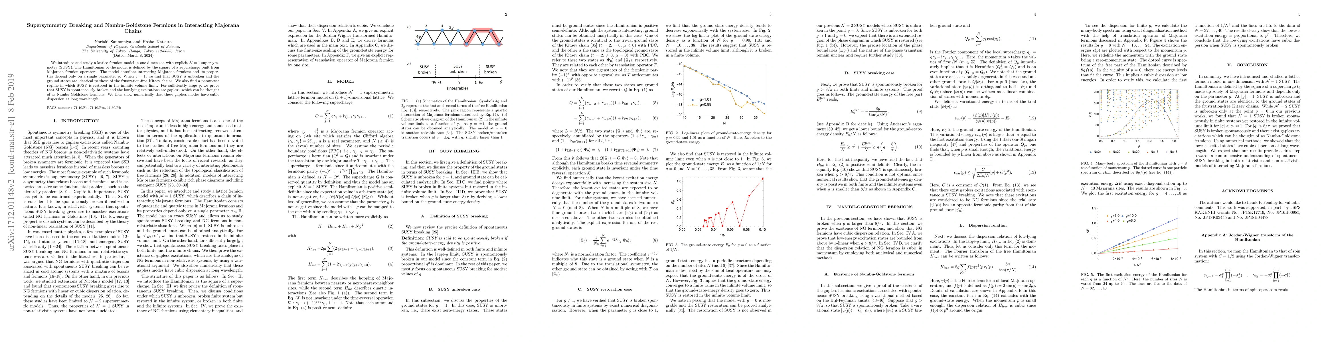 This paper studies a one-dimensional lattice fermion model with $\mathcal{N}=1$ supersymmetry, showing that for $g=1$ supersymmetry is unbroken and the ground states resemble those of Kitaev chains. For large $g$, the model exhibits spontaneous supersymmetry breaking, resulting in gapless Nambu-Goldstone fermions with cubic dispersion.