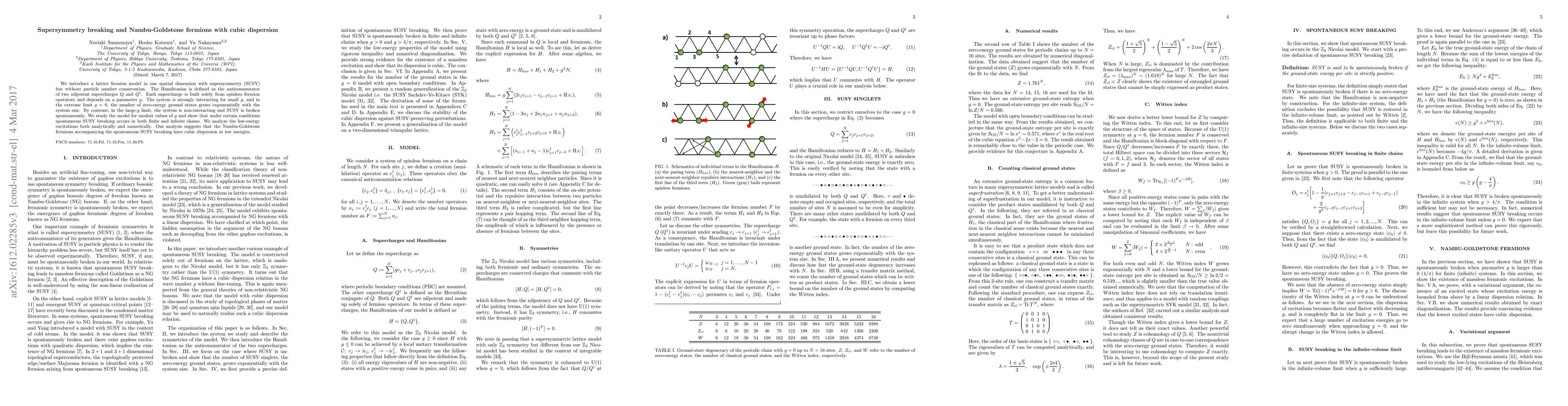 This paper presents a lattice fermion model in one dimension with supersymmetry but without particle number conservation, showing spontaneous supersymmetry breaking and the emergence of Nambu-Goldstone fermions with cubic dispersion in the low-energy spectrum. The model's behavior varies from strongly interacting to non-interacting states depending on the parameter $g$.