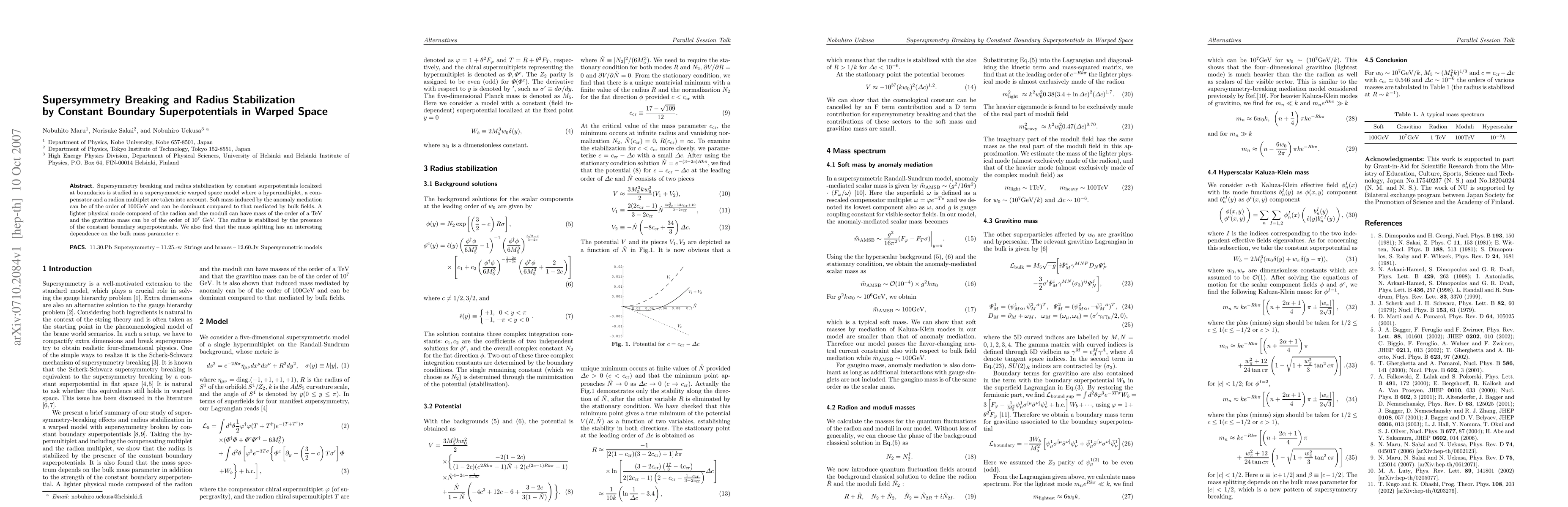 This paper investigates supersymmetry breaking and radius stabilization in a warped space model using constant boundary superpotentials. It finds that soft masses from anomaly mediation can be significant, with gravitino masses around 10^7 GeV and radion-moduli composite masses near a TeV.