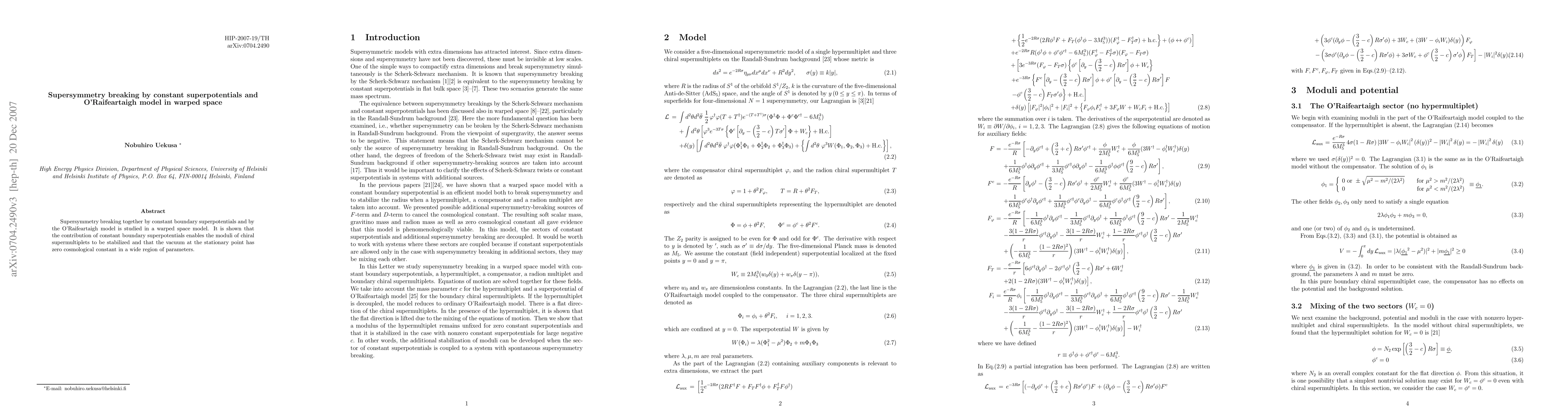This paper investigates supersymmetry breaking in a warped space model through constant boundary superpotentials and the O'Raifeartaigh model, demonstrating that constant boundary superpotentials stabilize moduli and achieve a zero cosmological constant in a broad parameter range.