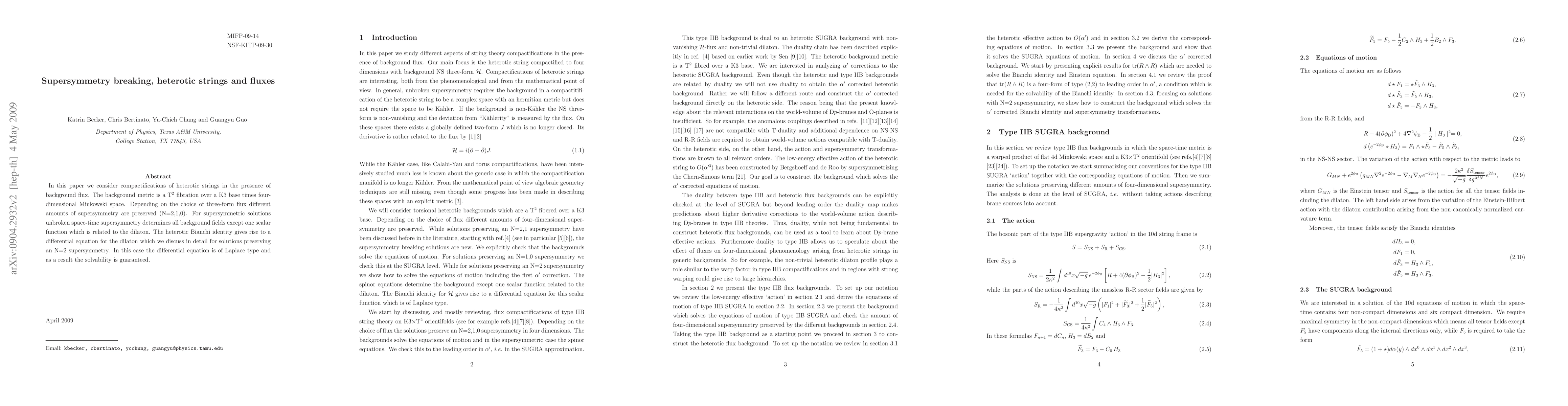 In this paper we consider compactifications of heterotic strings in the presence of background flux. The background metric is a T^2 fibration over a K3 base times four-dimensional Minkowski space. Depending on the choice of three-form flux different amounts of supersymmetry are preserved (N=2,1,0). For supersymmetric solutions unbroken space-time supersymmetry determines all background fields except one scalar function which is related to the dilaton. The heterotic Bianchi identity gives rise to a differential equation for the dilaton which we discuss in detail for solutions preserving an N=2 supersymmetry. In this case the differential equation is of Laplace type and as a result the solvability is guaranteed.