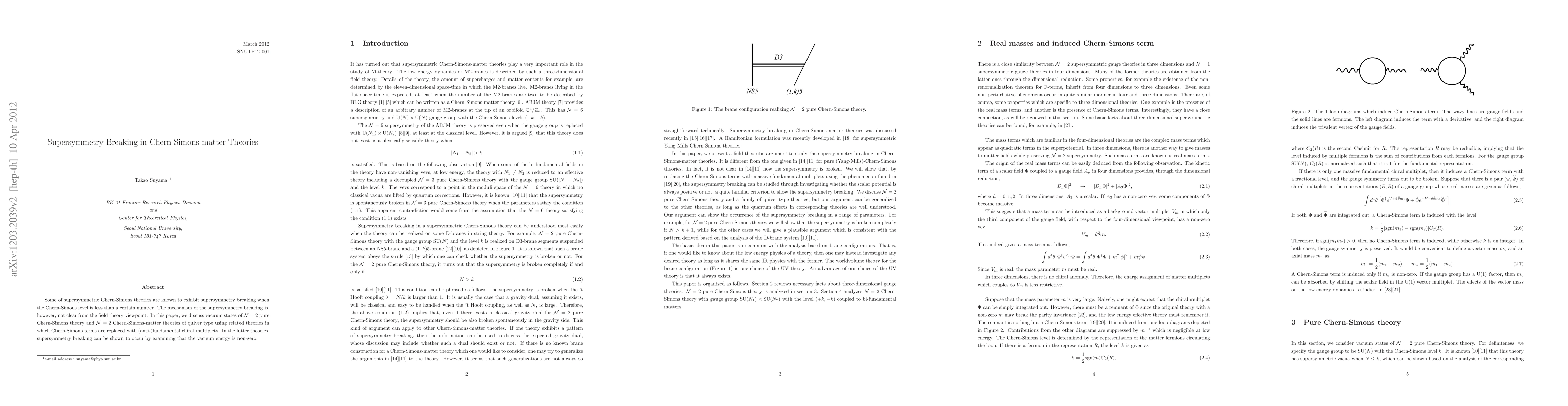 This paper investigates supersymmetry breaking in ${\cal N}=2$ pure Chern-Simons theory and ${\cal N}=2$ Chern-Simons-matter theories by analyzing vacuum states, revealing that supersymmetry breaks when the vacuum energy is non-zero, particularly when the Chern-Simons level is below a specific threshold.