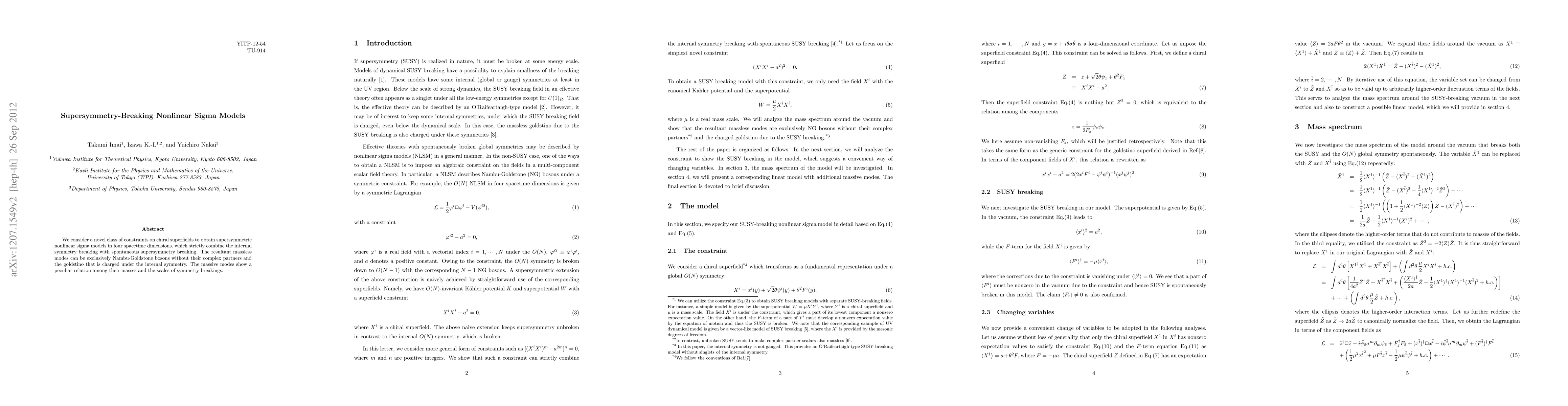 We consider a novel class of constraints on chiral superfields to obtain supersymmetric nonlinear sigma models in four spacetime dimensions, which strictly combine the internal symmetry breaking with spontaneous supersymmetry breaking. The resultant massless modes can be exclusively Nambu-Goldstone bosons without their complex partners and the goldstino that is charged under the internal symmetry. The massive modes show a peculiar relation among their masses and the scales of symmetry breakings.