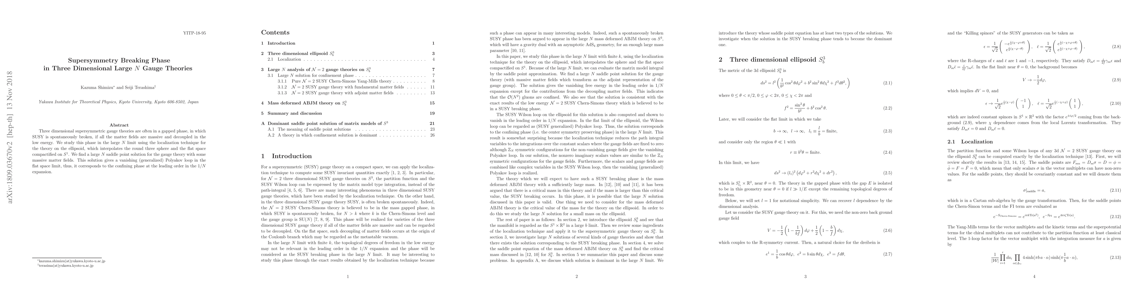 This paper investigates the supersymmetry breaking phase in three-dimensional large N gauge theories using localization techniques on an ellipsoid. It finds a large N saddle point solution indicating a confining phase in the flat space limit.