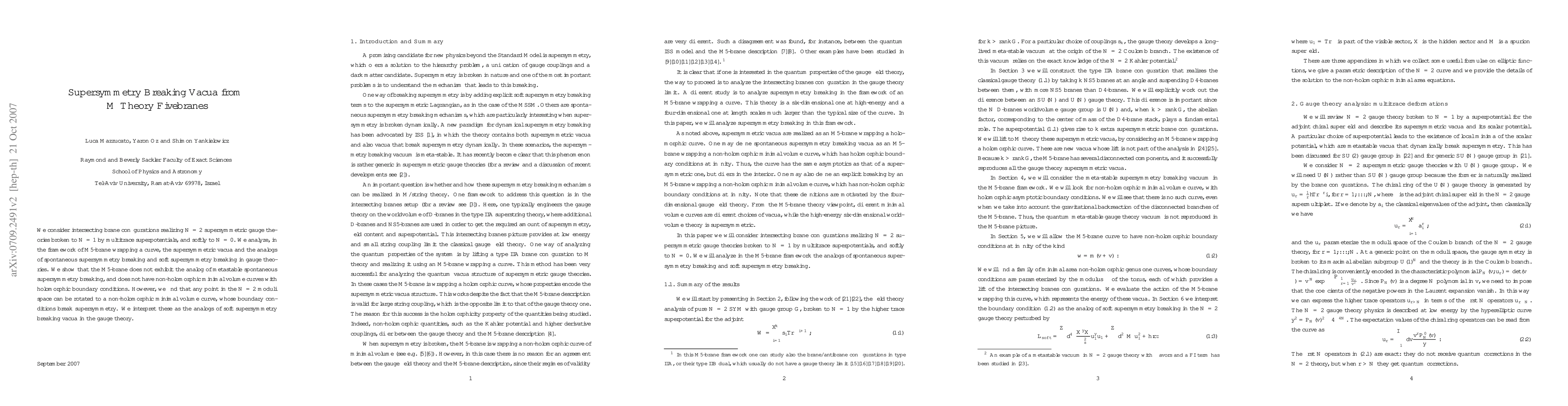 We consider intersecting brane configurations realizing N=2 supersymmetric gauge theories broken to N=1 by multitrace superpotentials, and softly to N=0. We analyze, in the framework of M5-brane wrapping a curve, the supersymmetric vacua and the analogs of spontaneous supersymmetry breaking and soft supersymmetry breaking in gauge theories. We show that the M5-brane does not exhibit the analog of metastable spontaneous supersymmetry breaking, and does not have non-holomorphic minimal volume curves with holomorphic boundary conditions. However, we find that any point in the N=2 moduli space can be rotated to a non-holomorphic minimal volume curve, whose boundary conditions break supersymmetry. We interpret these as the analogs of soft supersymmetry breaking vacua in the gauge theory.