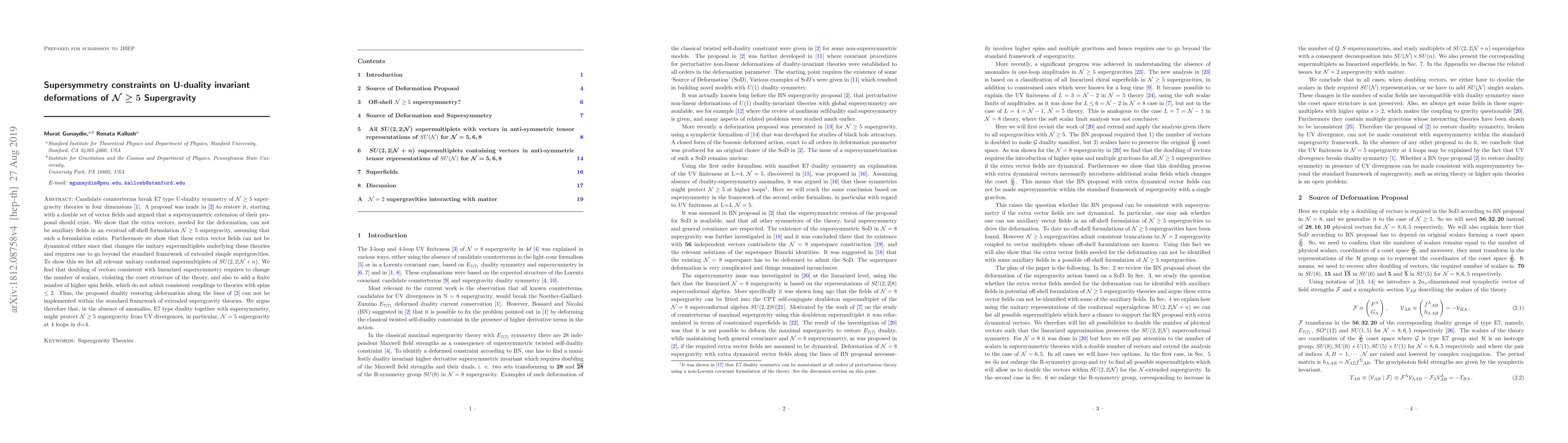 Candidate counterterms break E7 type U-duality symmetry of $N \geq 5$ supergravity theories in four dimensions \cite{Kallosh:2011dp}. A proposal was made in \cite{Bossard:2011ij} to restore it, starting with a double set of vector fields and argued that a supersymmetric extension of their proposal should exist. We show that the extra vectors, needed for the deformation, can not be auxiliary fields in an eventual off-shell formulation $N \geq 5$ supergravity, assuming that such a formulation exists. Furthermore we show that these extra vector fields can not be dynamical either since that changes the unitary supermultiplets underlying these theories and requires one to go beyond the standard framework of extended simple supergravities. To show this we list all relevant unitary conformal supermultiplets of $SU(2,2|N+n)$. We find that doubling of vectors consistent with linearized supersymmetry requires to change the number of scalars, violating the coset structure of the theory, and also to add a finite number of higher spin fields, which do not admit consistent couplings to theories with spins $\leq 2$. Thus, the proposed duality restoring deformation along the lines of \cite{Bossard:2011ij} can not be implemented within the standard framework of extended supergravity theories. We argue therefore that, in the absence of anomalies, E7 type duality together with supersymmetry, might protect $N \geq 5$ supergravity from UV divergences, in particular, $N=5$ supergravity at 4 loops in d=4.