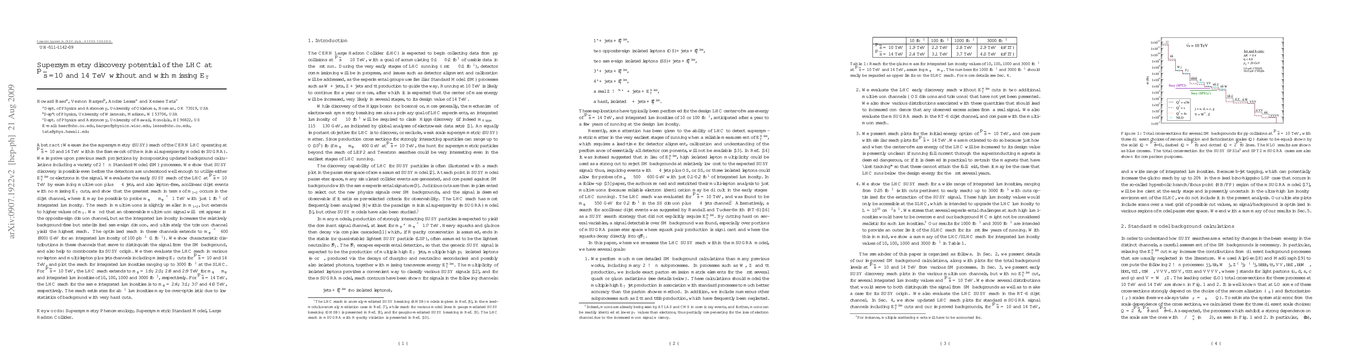 We examine the supersymmetry (SUSY) reach of the CERN LHC operating at $\sqrt{s}=10$ and 14 TeV within the framework of the minimal supergravity model. We improve upon previous reach projections by incorporating updated background calculations including a variety of $2\to n$ Standard Model (SM) processes. We show that SUSY discovery is possible even before the detectors are understood well enough to utilize either $E_T^{\rm miss}$ or electrons in the signal. We evaluate the early SUSY reach of the LHC at $\sqrt{s}=10$ TeV by examining multi-muon plus $\ge4$ jets and also dijet events with {\it no} missing $E_T$ cuts and show that the greatest reach in terms of $m_{1/2}$ occurs in the dijet channel. The reach in multi-muons is slightly smaller in $m_{1/2}$, but extends to higher values of $m_0$. We find that an observable multi-muon signal will first appear in the opposite-sign dimuon channel, but as the integrated luminosity increases the relatively background-free but rate-limited same-sign dimuon, and ultimately the trimuon channel yield the highest reach. We show characteristic distributions in these channels that serve to distinguish the signal from the SM background, and also help to corroborate its SUSY origin. We then evaluate the LHC reach in various no-lepton and multi-lepton plus jets channels {\it including} missing $E_T$ cuts for $\sqrt{s}=10$ and 14 TeV, and plot the reach for integrated luminosities ranging up to 3000 fb$^{-1}$ at the SLHC. For $\sqrt{s}=10$ TeV, the LHC reach extends to $m_{gluino}=1.9, 2.3, 2.8$ and 2.9 TeV for $m_{squark}\sim m_{gluino}$ and integrated luminosities of 10, 100, 1000 and 3000 fb$^{-1}$, respectively. For $\sqrt{s}=14$ TeV, the LHC reach for the same integrated luminosities is to $m_{gluino}=2.4,\3.1, 3.7$ and 4.0 TeV.