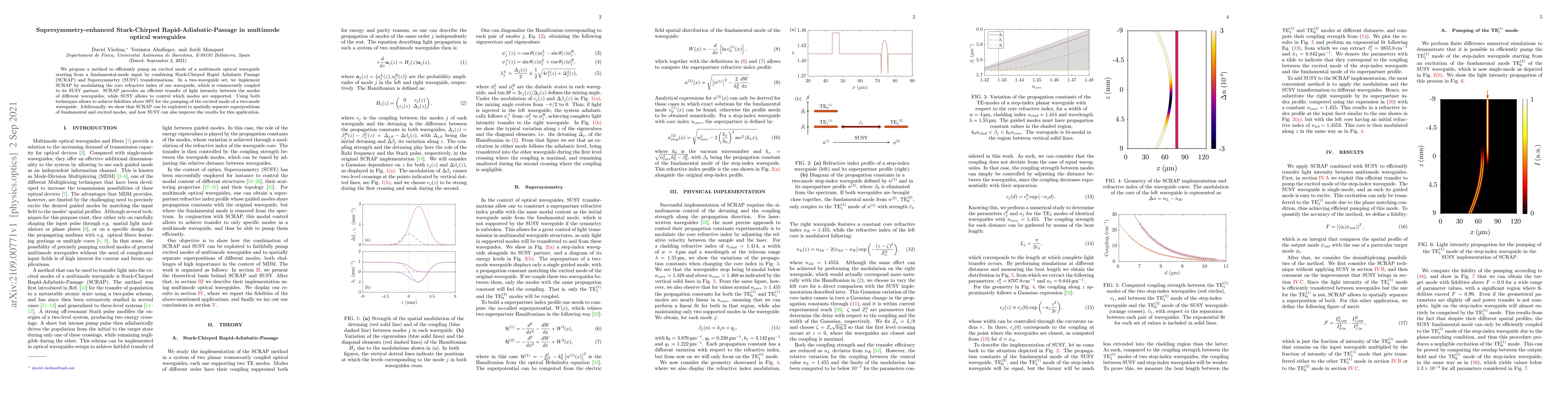This paper proposes a method combining Stark-Chirped Rapid Adiabatic Passage (SCRAP) and Supersymmetry (SUSY) to efficiently pump an excited mode in a multimode optical waveguide from a fundamental-mode input. The method achieves over 99% fidelity and can spatially separate superpositions of fundamental and excited modes.