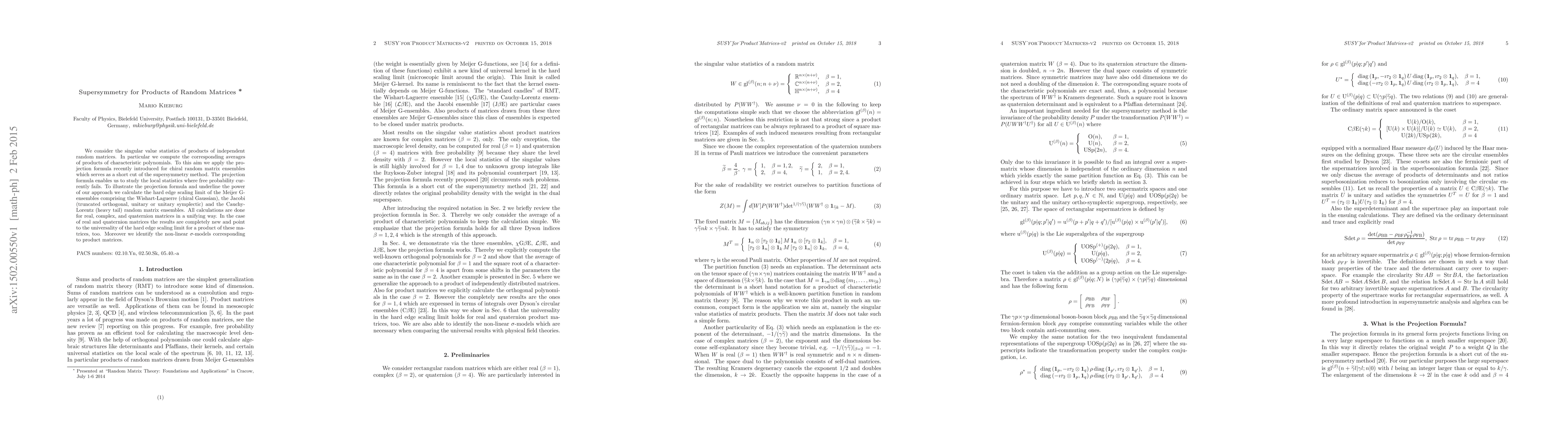 We consider the singular value statistics of products of independent random matrices. In particular we compute the corresponding averages of products of characteristic polynomials. To this aim we apply the projection formula recently introduced for chiral random matrix ensembles which serves as a short cut of the supersymmetry method. The projection formula enables us to study the local statistics where free probability currently fails. To illustrate the projection formula and underlining the power of our approach we calculate the hard edge scaling limit of the Meijer G-ensembles comprising the Wishart-Laguerre (chiral Gaussian), the Jacobi (truncated orthogonal, unitary or unitray symplectic) and the Cauchy-Lorentz (heavy tail) random matrix ensembles. All calculations are done for real, complex, and quaternion matrices in a unifying way. In the case of real and quaternion matrices the results are completely new and point to the universality of the hard edge scaling limit for a product of these matrices, too. Moreover we identify the non-linear $\sigma$-models corresponding to product matrices.