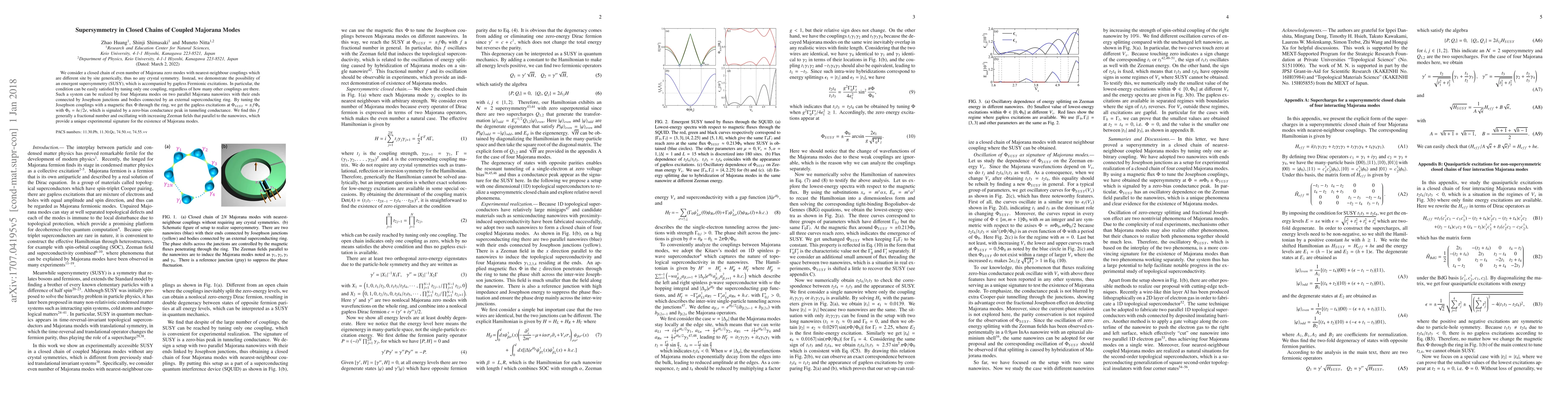 We consider a closed chain of even number of Majorana zero modes with nearest-neighbour couplings which are different site by site generically, thus no any crystal symmetry. Instead, we demonstrate the possibility of an emergent supersymmetry (SUSY), which is accompanied by gapless Fermionic excitations. In particular, the condition can be easily satisfied by tuning only one coupling, regardless of how many other couplings are there. Such a system can be realized by four Majorana modes on two parallel Majorana nanowires with their ends connected by Josephson junctions and bodies connected by an external superconducting ring. By tuning the Josephson couplings with a magnetic flux $\Phi$ through the ring, we get the gapless excitations at $\Phi_{SUSY}=\pm f\Phi_0$ with $\Phi_0= hc/2e$, which is signaled by a zero-bias conductance peak in tunneling conductance. We find this $f$ generally a fractional number and oscillating with increasing Zeeman fields that parallel to the nanowires, which provide a unique experimental signature for the existence of Majorana modes.