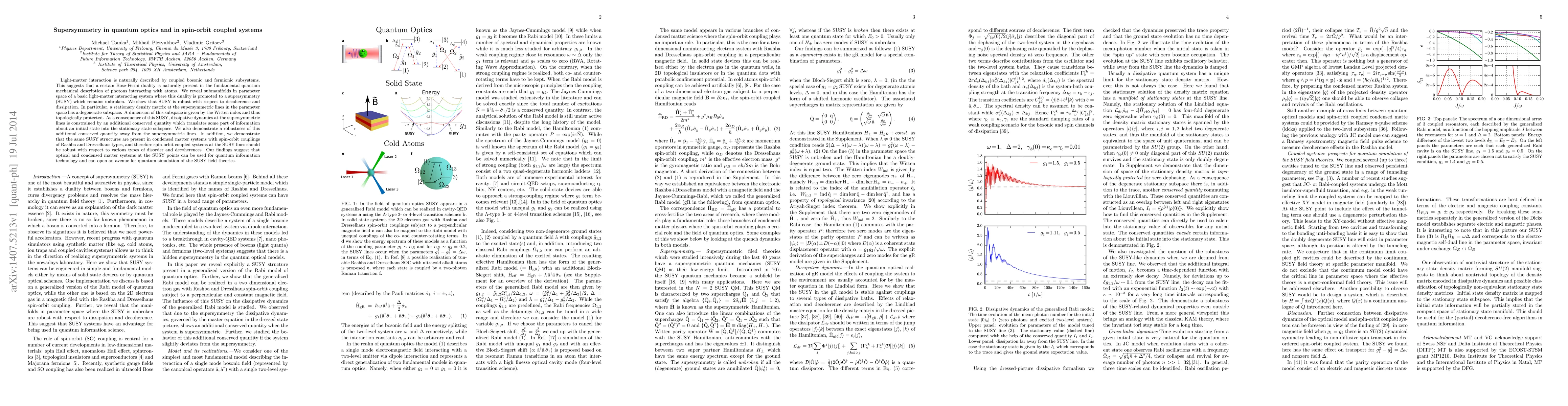Light-matter interaction is naturally described by coupled bosonic and fermionic subsystems. This suggests that a certain Bose-Fermi duality is naturally present in the fundamental quantum mechanical description of photons interacting with atoms. We reveal submanifolds in parameter space of a basic light-matter interacting system where this duality is promoted to a supersymmetry (SUSY) which remains unbroken. We show that SUSY is robust with respect to decoherence and dissipation. In particular, a stationary density matrix at the supersymmetric lines in the parameter space has a degenerate subspace. A dimension of this subspace is given by the Witten index and thus topologically protected. As a consequence of this SUSY, dissipative dynamics at the supersymmetric lines is constrained by an additional conserved quantity which translates some part of information about an initial state into the stationary state subspace. We also demonstrate a robustness of this additional conserved quantity away from the supersymmetric lines. In addition, we demonstrate that the same SUSY structures are present in condensed matter systems with spin-orbit couplings of Rashba and Dresselhaus types, and therefore spin-orbit coupled systems at the SUSY lines should be robust with respect to various types of disorder and decoherences. Our findings suggest that optical and condensed matter systems at the SUSY points can be used for quantum information technology and can open an avenue for quantum simulation of the SUSY field theories.