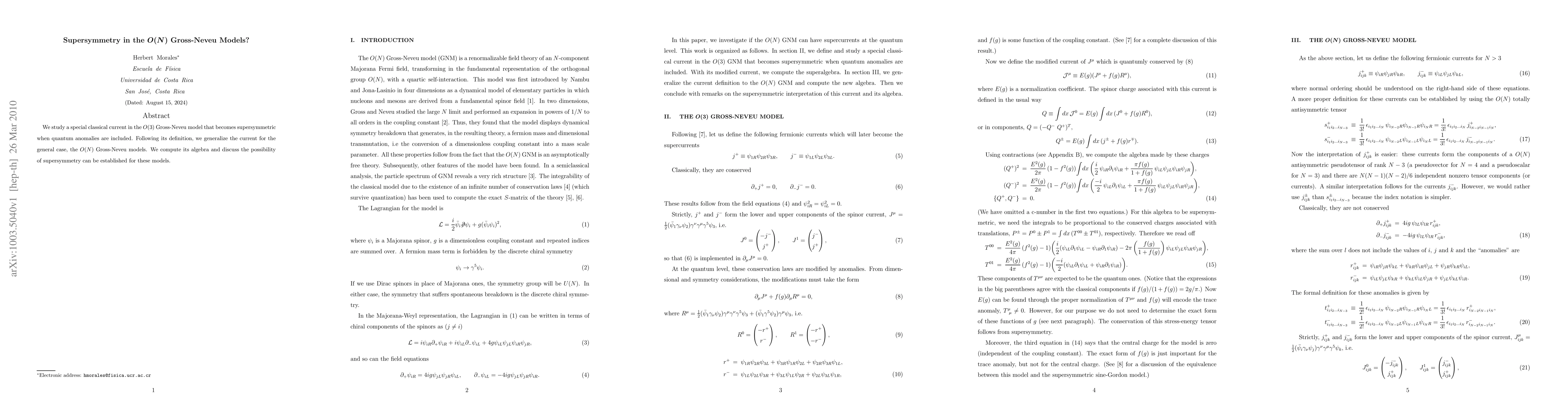 This research investigates a special classical current in the O(3) Gross-Neveu model that exhibits supersymmetry upon accounting for quantum anomalies, and generalizes this analysis to O(N) Gross-Neveu models, computing its algebra to explore the potential for supersymmetry in these broader models.