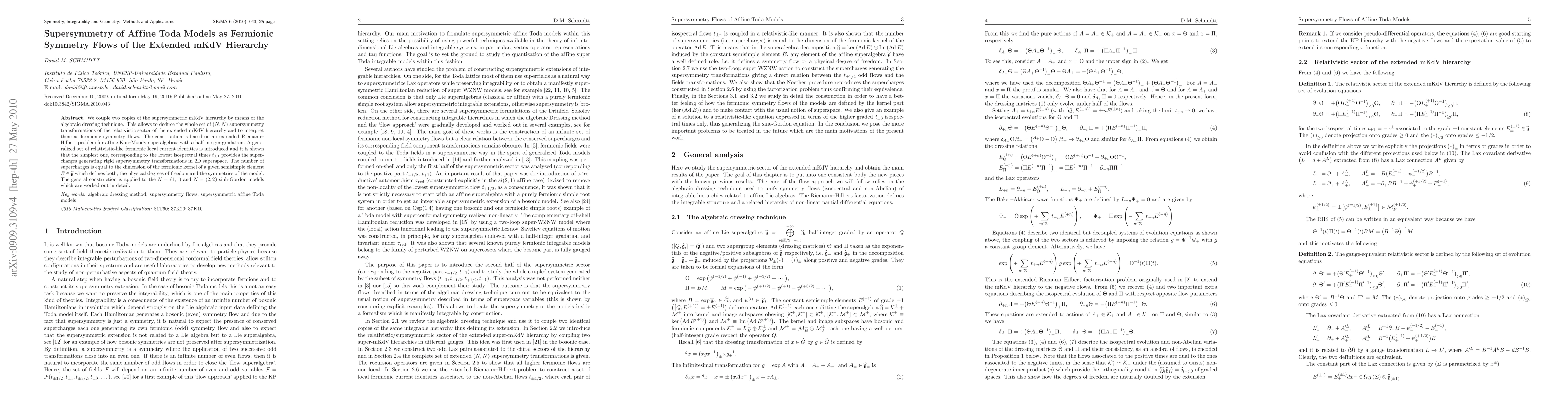 We couple two copies of the supersymmetric mKdV hierarchy by means of the algebraic dressing technique. This allows to deduce the whole set of $(N,N)$ supersymmetry transformations of the relativistic sector of the extended mKdV hierarchy and to interpret them as fermionic symmetry flows. The construction is based on an extended Riemann-Hilbert problem for affine Kac-Moody superalgebras with a half-integer gradation. A generalized set of relativistic-like fermionic local current identities is introduced and it is shown that the simplest one, corresponding to the lowest isospectral times $t_{\pm 1}$ provides the supercharges generating rigid supersymmetry transformations in 2D superspace. The number of supercharges is equal to the dimension of the fermionic kernel of a given semisimple element $E \in \widehat{\mathfrak{g}}$ which defines both, the physical degrees of freedom and the symmetries of the model. The general construction is applied to the $N=(1,1)$ and $N=(2,2)$ sinh-Gordon models which are worked out in detail.