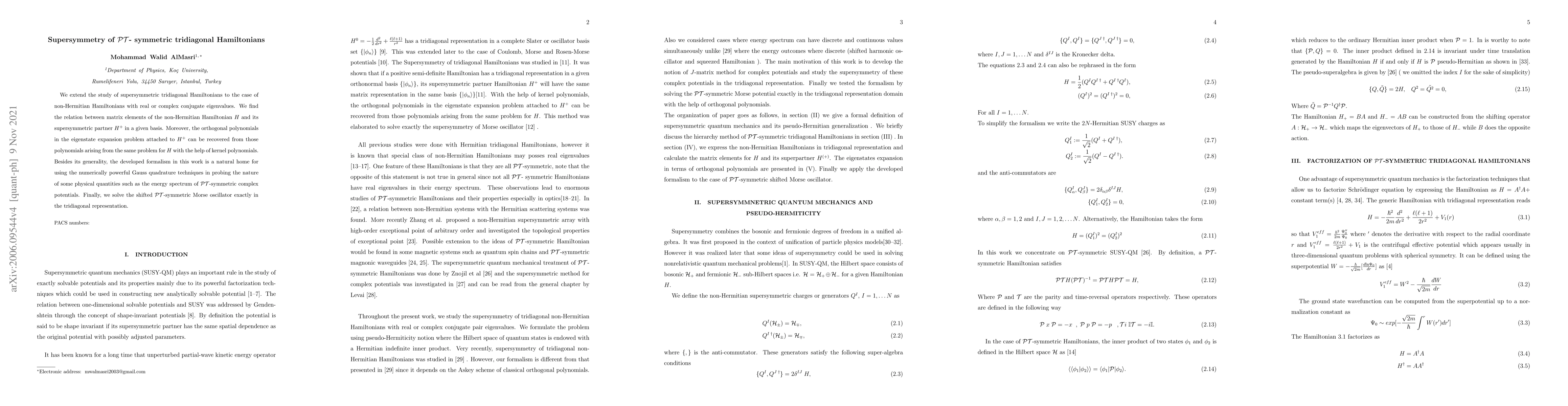 This paper explores the supersymmetry of $\mathcal{PT}$-symmetric tridiagonal Hamiltonians, establishing a relationship between their matrix elements and those of their supersymmetric partners. It also demonstrates how orthogonal polynomials associated with the supersymmetric partner can be derived from those of the original Hamiltonian, facilitating the use of Gauss quadrature techniques for analyzing physical quantities.