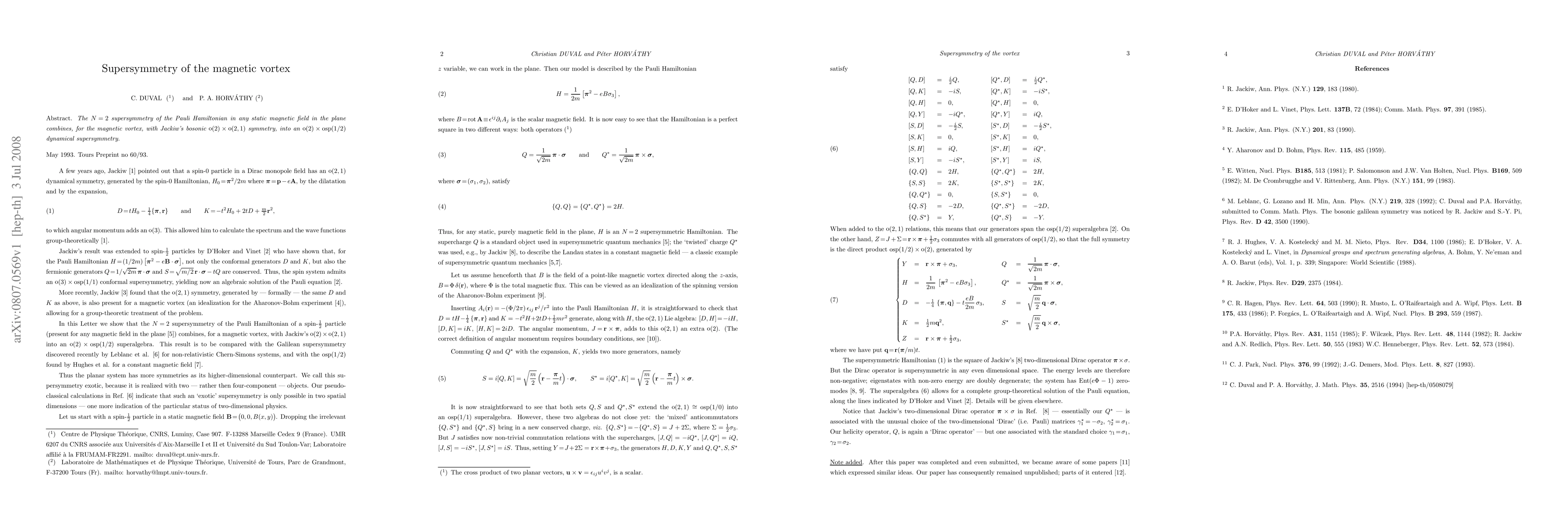 The N=2 supersymmetry of the Pauli Hamiltonian in any static magnetic field in the plane combines, for the magnetic vortex, with Jackiw's bosonic $o(2)\times o(2,1)$ symmetry, into an $o(2)\times osp(1/2)$ dynamical supersymmetry.