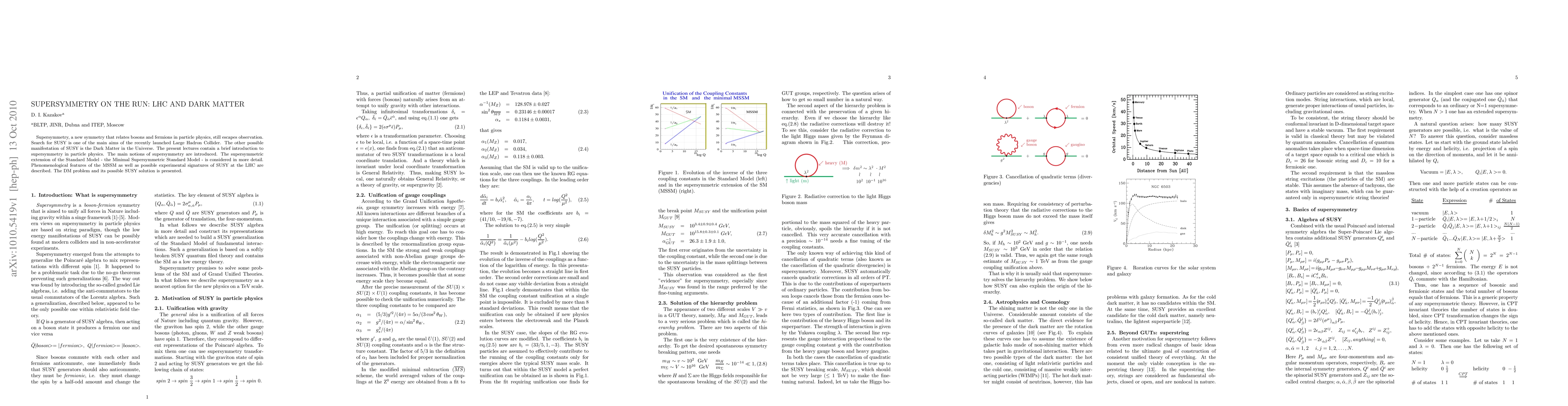 The paper discusses Supersymmetry (SUSY), a hypothetical symmetry linking bosons and fermions, and its potential observation at the Large Hadron Collider (LHC). It introduces SUSY in particle physics, focuses on the Minimal Supersymmetric Standard Model (MSSM), and describes its phenomenological aspects and possible LHC signatures. Additionally, it explores SUSY's role in the Dark Matter problem.