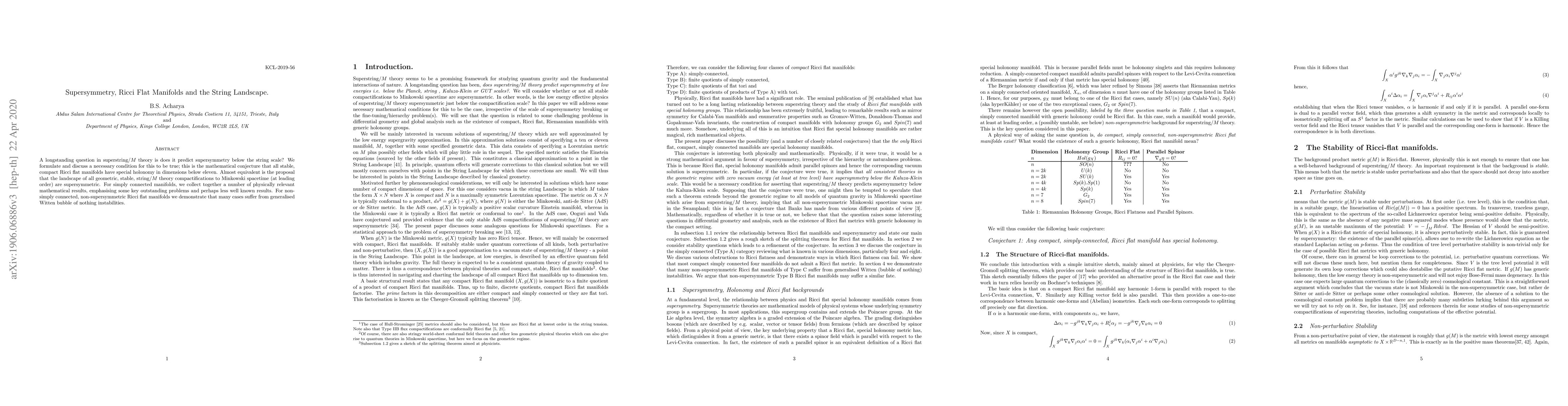 This paper explores the conjecture that stable, compact Ricci flat manifolds below dimension eleven exhibit special holonomy, implying supersymmetry in superstring/$M$ theory. It also discusses the landscape of supersymmetric compactifications and identifies instabilities in non-simply connected, non-supersymmetric Ricci flat manifolds.