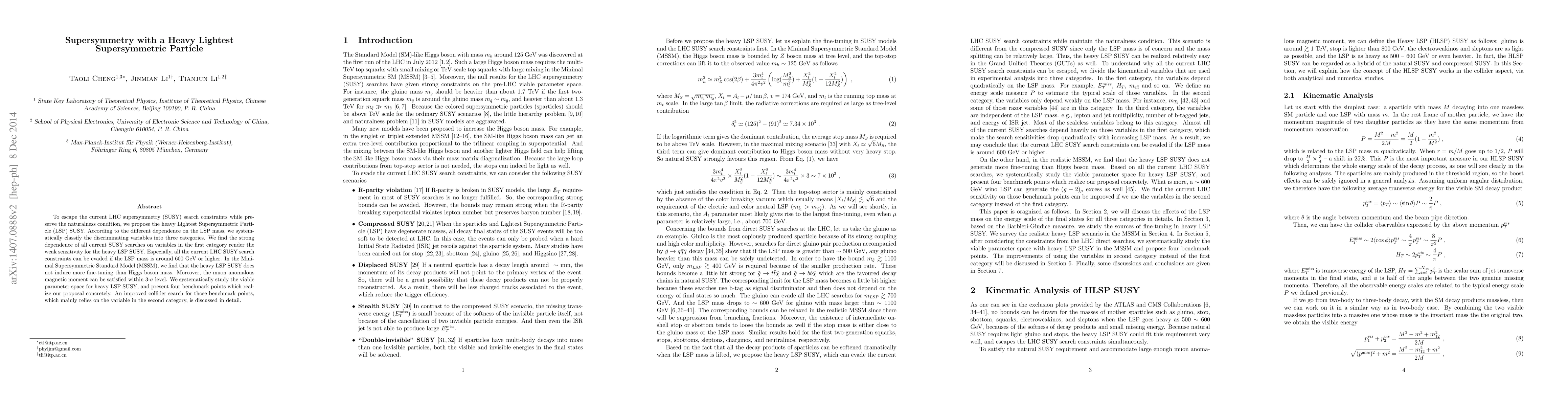 To escape the current LHC supersymmetry (SUSY) search constraints while preserve the naturalness condition, we propose the heavy Lightest Supersymmetric Particle (LSP) SUSY. According to the different dependence on the LSP mass, we systematically classify the discriminating variables into three categories. We find the strong dependence of all current SUSY searches on variables in the first category render the weak sensitivity for the heavy LSP SUSY. Especially, all the current LHC SUSY search constraints can be evaded if the LSP mass is around 600 GeV or higher. In the Minimal Supersymmetric Standard Model (MSSM), we find that the heavy LSP SUSY does not induce more fine-tuning than Higgs boson mass. Moreover, the muon anomalous magnetic moment can be satisfied within 3-$\sigma$ level. We systematically study the viable parameter space for heavy LSP SUSY, and present four benchmark points which realize our proposal concretely. An improved collider search for those benchmark points, which mainly relies on the variable in the second category, is discussed in detail.
