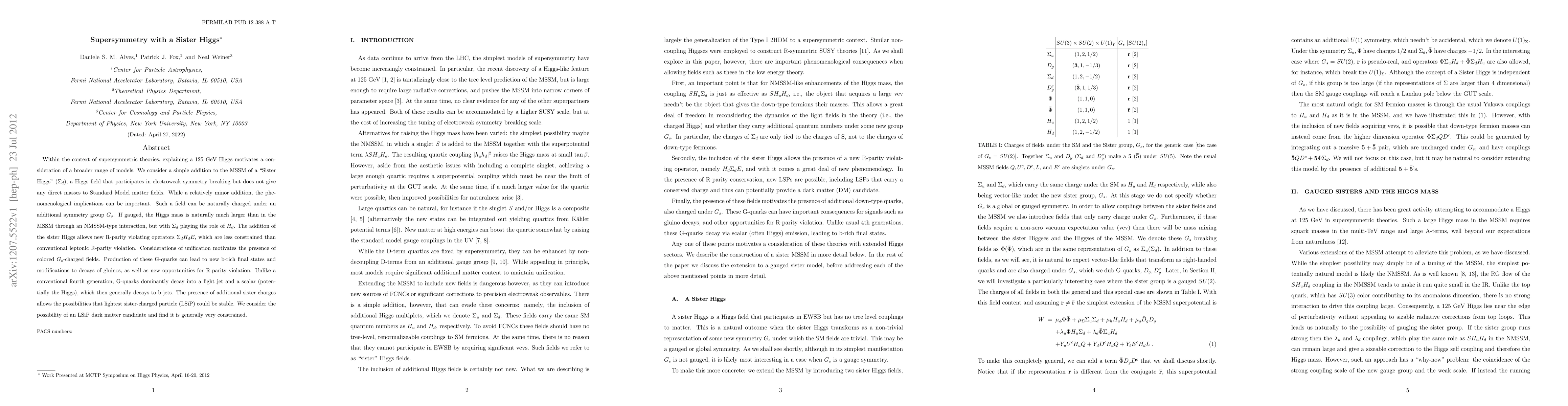 Within the context of supersymmetric theories, explaining a 125 GeV Higgs motivates a consideration of a broader range of models. We consider a simple addition to the MSSM of a "Sister Higgs" ($\Sigma_d$), a Higgs field that participates in electroweak symmetry breaking but does not give any direct masses to Standard Model matter fields. While a relatively minor addition, the phenomenological implications can be important. Such a field can be naturally charged under an additional symmetry group $G_s$. If gauged, the Higgs mass is naturally much larger than in the MSSM through an NMSSM-type interaction, but with $\Sigma_d$ playing the role of $H_d$. The addition of the sister Higgs allows new R-parity violating operators $\Sigma_d H_d E$, which are less constrained than conventional leptonic R-parity violation. Considerations of unification motivates the presence of colored $G_s$-charged fields. Production of these G-quarks can lead to new b-rich final states and modifications to decays of gluinos, as well as new opportunities for R-parity violation. Unlike a conventional fourth generation, G-quarks dominantly decay into a light jet and a scalar (potentially the Higgs), which then generally decays to b-jets. The presence of additional sister charges allows the possibilities that lightest sister-charged particle (LSiP) could be stable. We consider the possibility of an LSiP dark matter candidate and find it is generally very constrained.