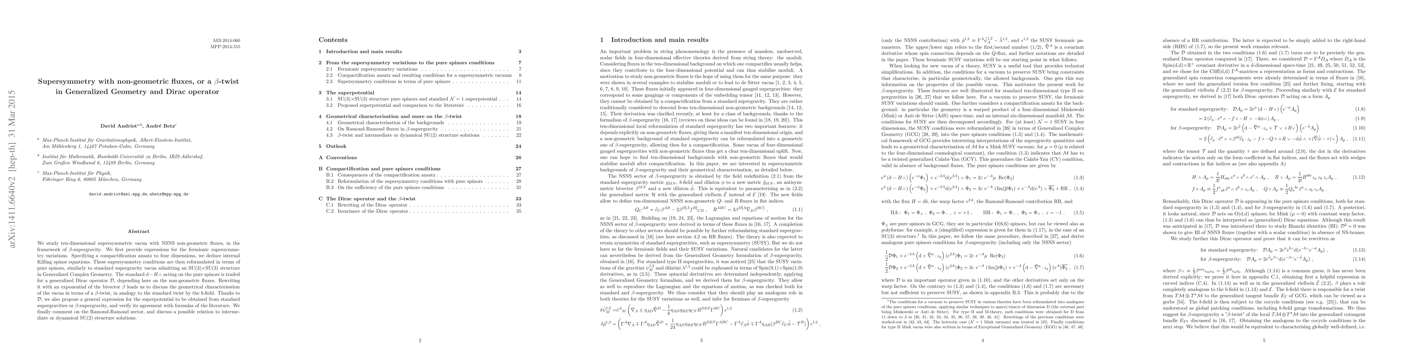 This paper explores supersymmetric vacua in ten-dimensional $\beta$-supergravity with NSNS non-geometric fluxes, reformulating internal supersymmetry conditions in terms of pure spinors and a generalized Dirac operator. It proposes a $\beta$-twist in Generalized Geometry analogous to the b-field twist and provides a new expression for the superpotential.