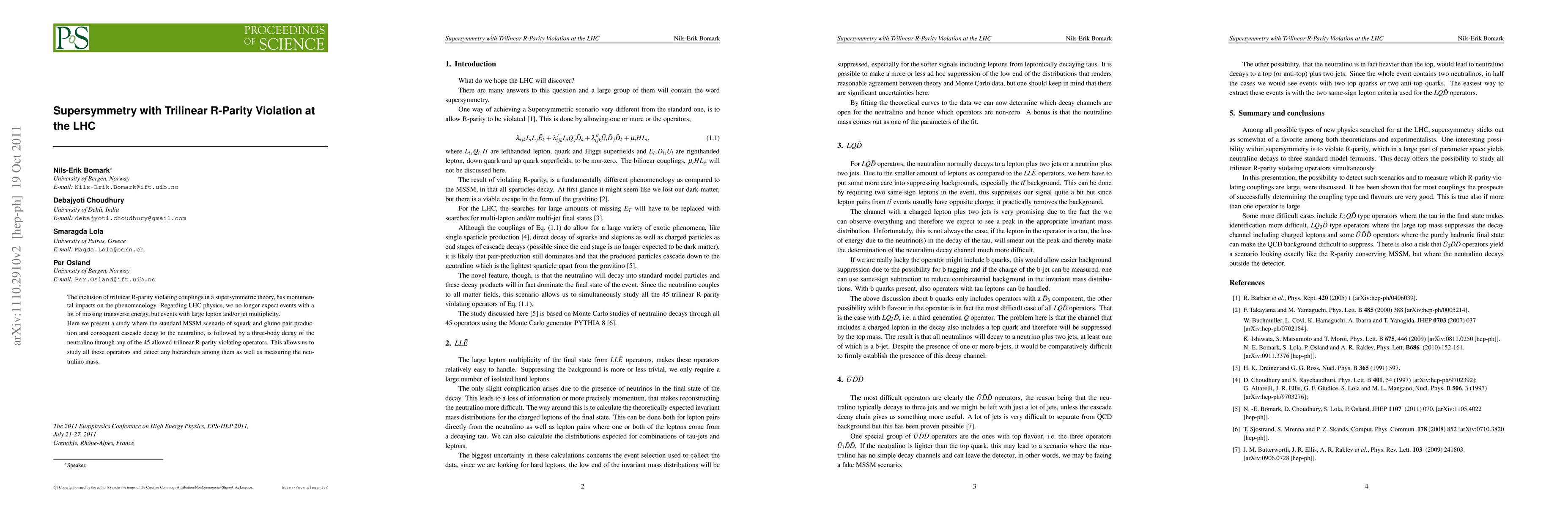 The inclusion of trilinear R-parity violating couplings in a supersymmetric theory, has monumental impacts on the phenomenology. Regarding LHC physics, we no longer expect events with a lot of missing transverse energy, but events with large lepton and/or jet multiplicity. Here we present a study where the standard MSSM scenario of squark and gluino pair production and consequent cascade decay to the neutralino, is followed by a three-body decay of the neutralino through any of the 45 allowed trilinear R-parity violating operators. This allows us to study all these operators and detect any hierarchies among them as well as measuring the neutralino mass.