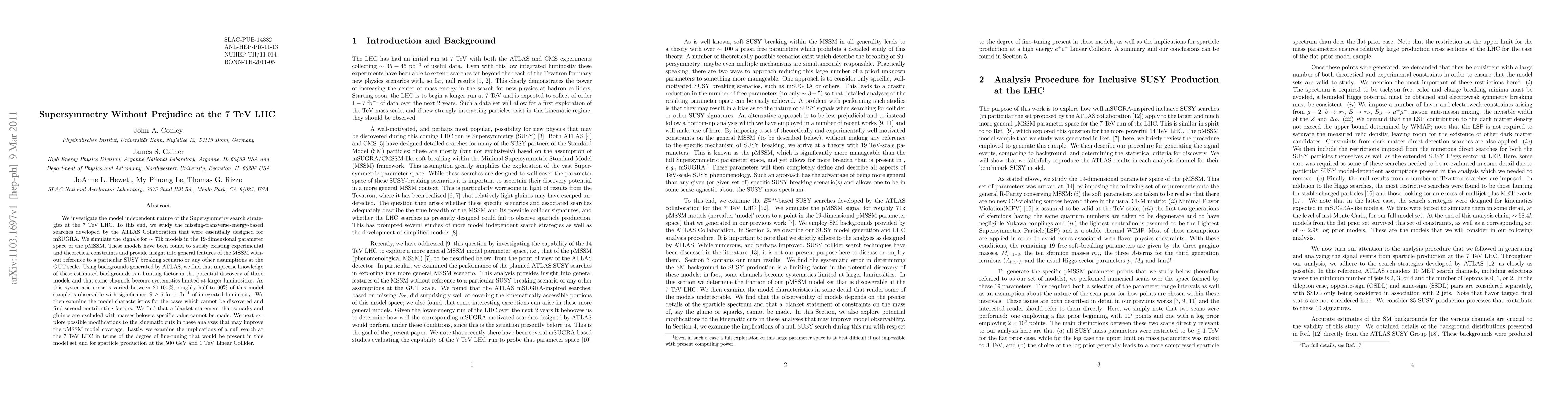 This paper explores the model-independent search strategies for Supersymmetry at the 7 TeV LHC, simulating signals from ~71k models in the pMSSM parameter space. It finds that while roughly half to 90% of these models could be observable with 1 fb^{-1} of data, imprecise background estimates limit discovery potential, and no blanket exclusion can be made for squarks and gluinos.